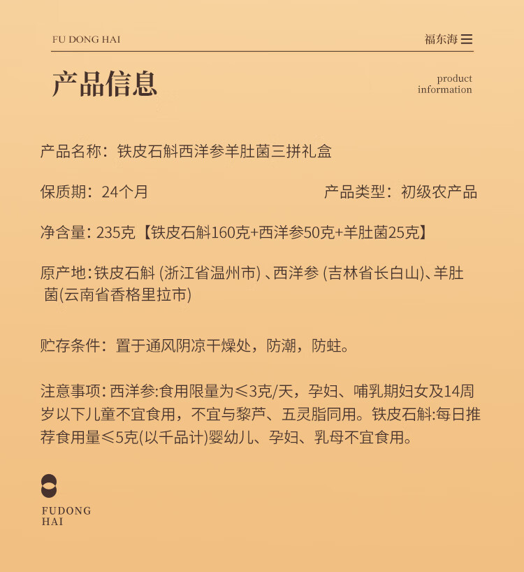 商品名称:福东海铁皮石斛西洋参羊肚菌三拼礼盒235g