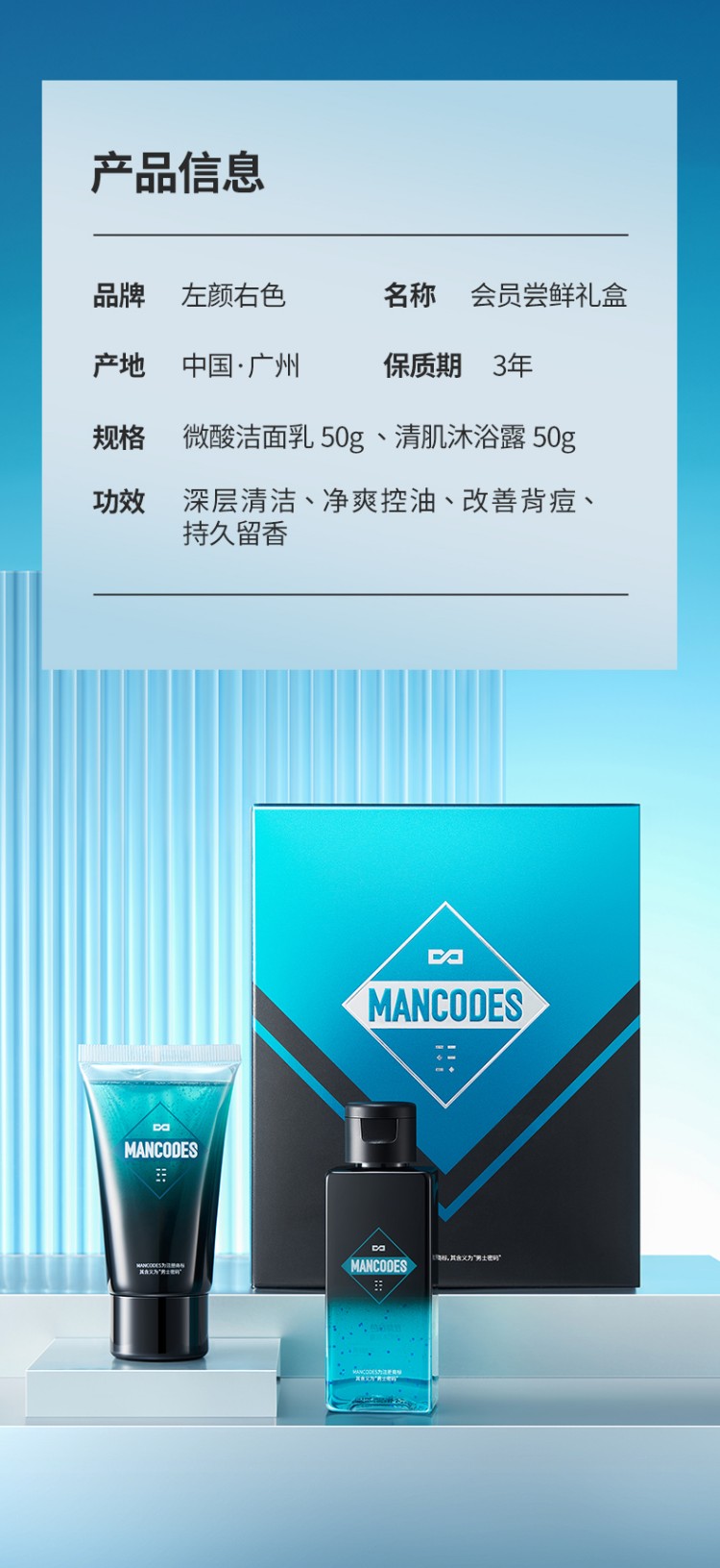 商品名称:MANCODES/左颜右色男士会员尝鲜礼盒沐浴露50g+洁面乳50g