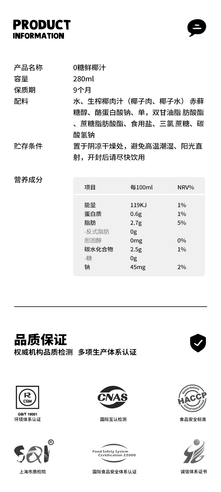 商品名称:椰子知道0糖鲜椰汁整箱280ml*15瓶