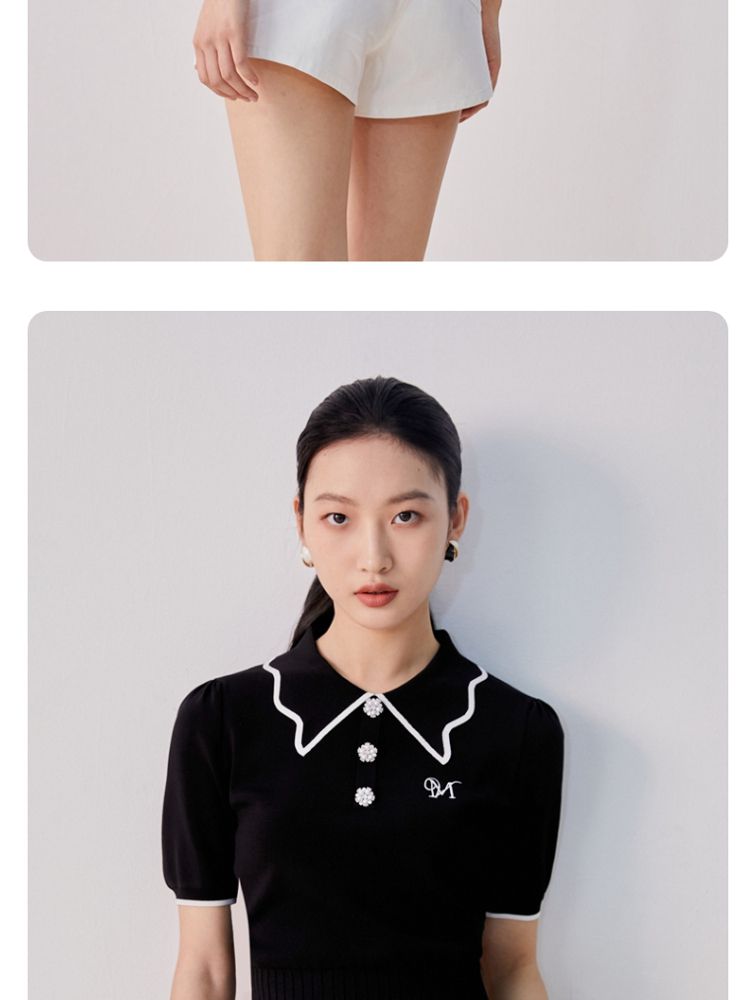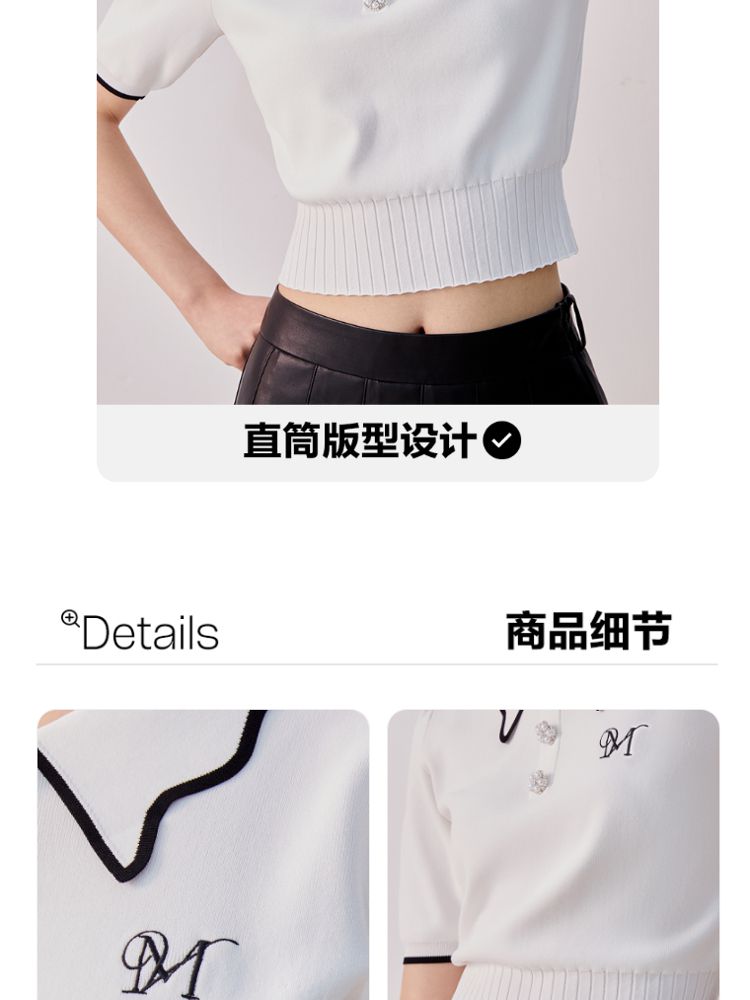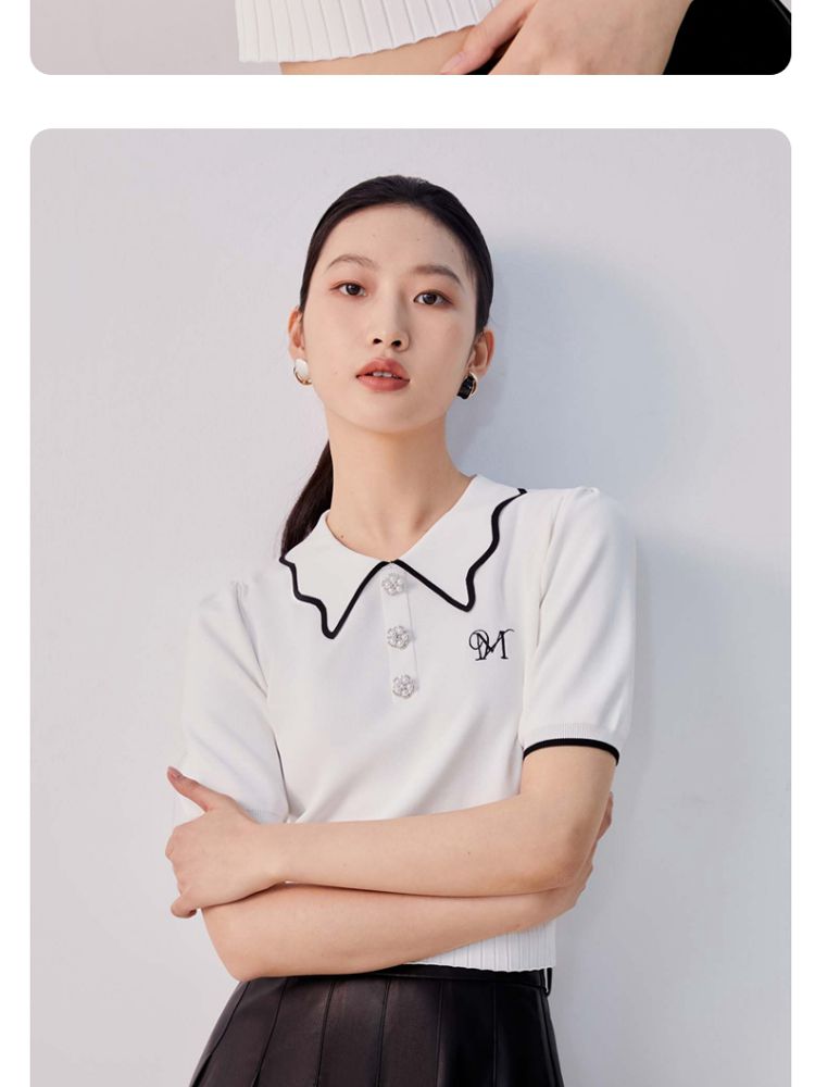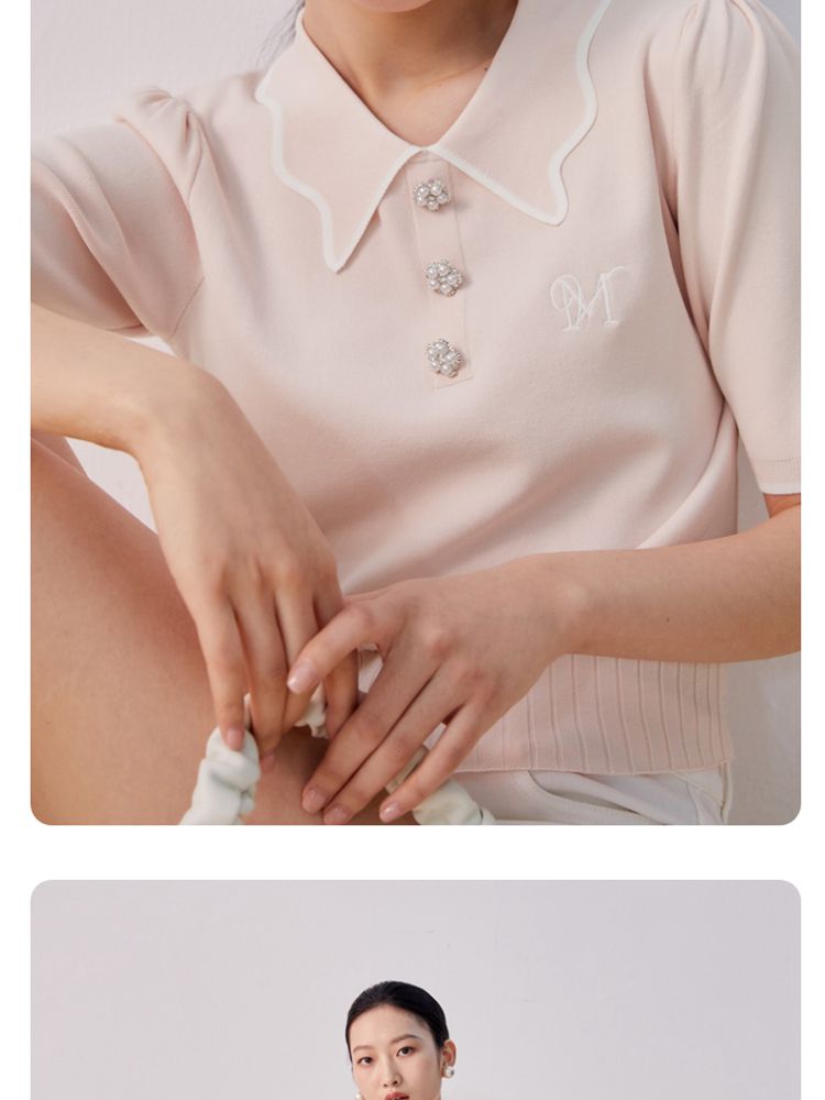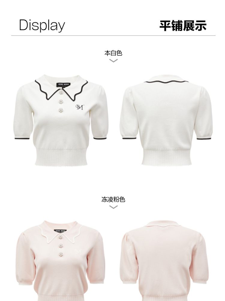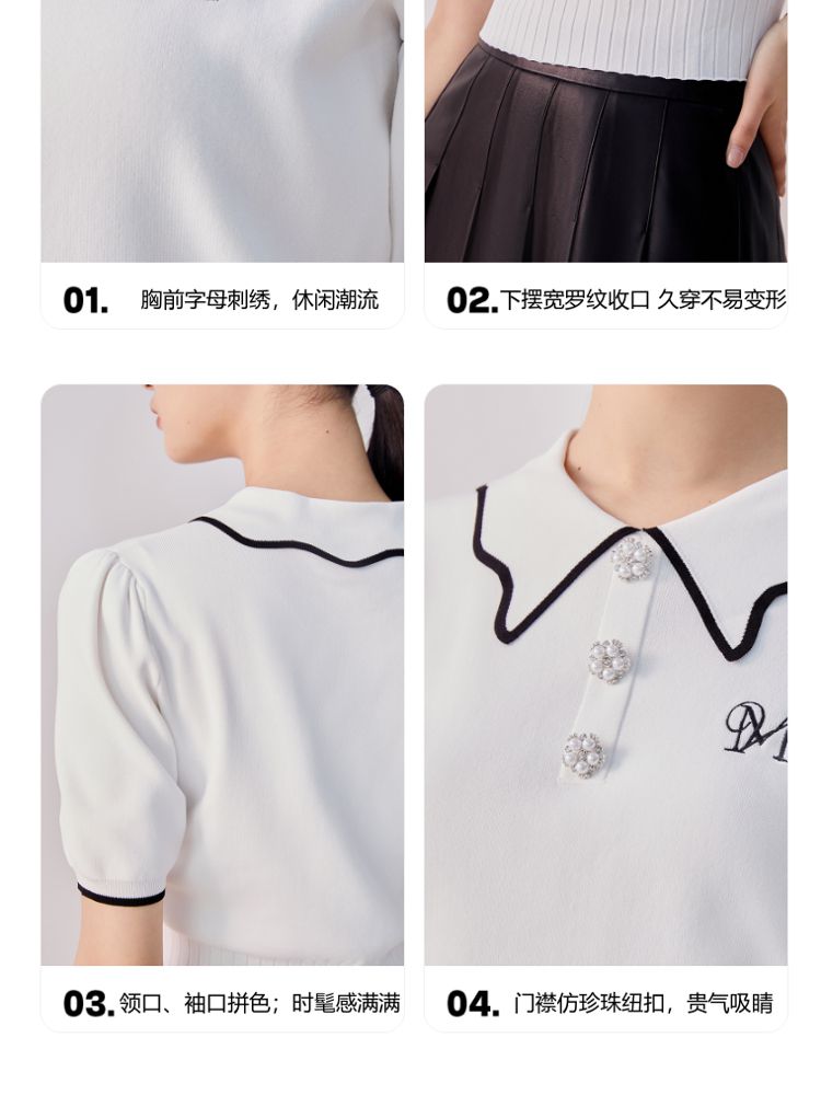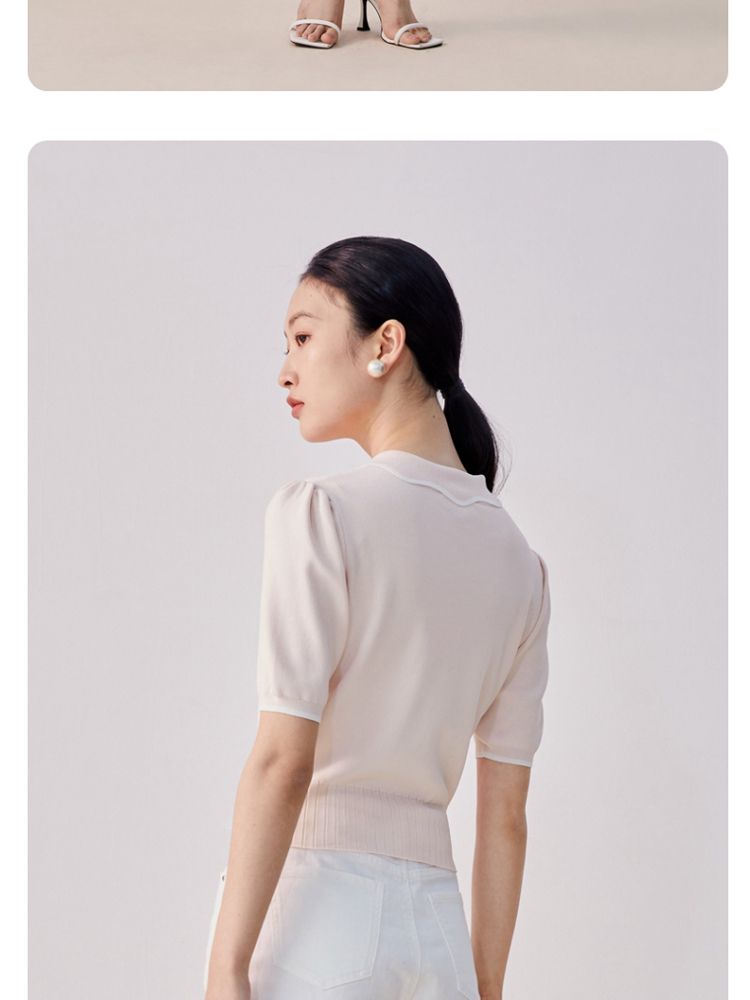 商品名称:【甜美通勤】翻领拼色泡泡袖刺绣短袖针织衫女 165329