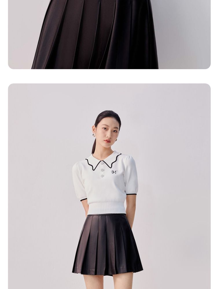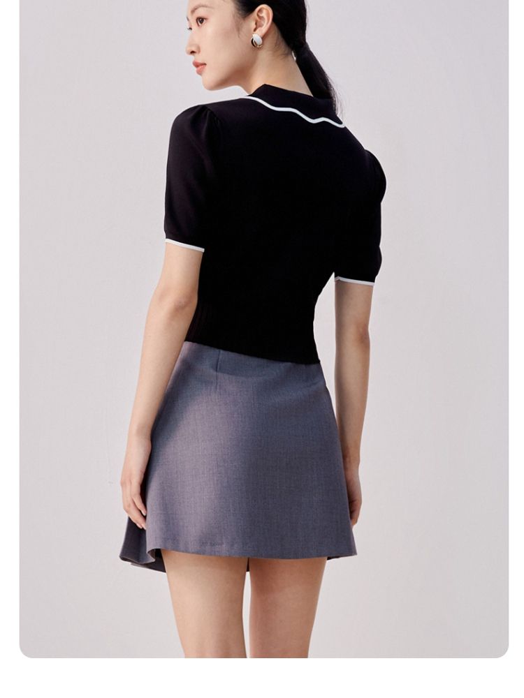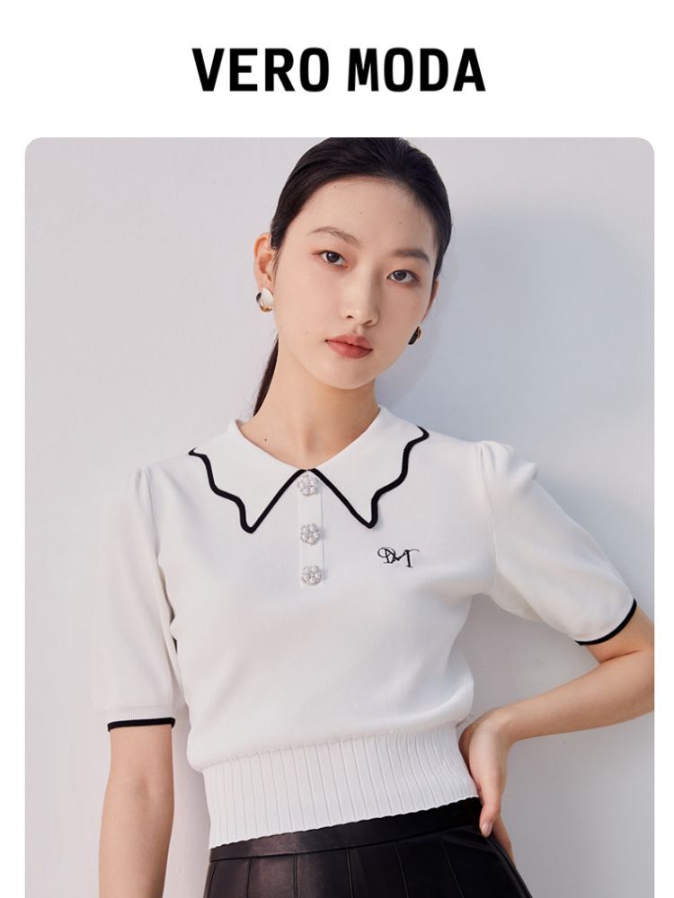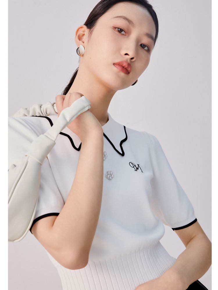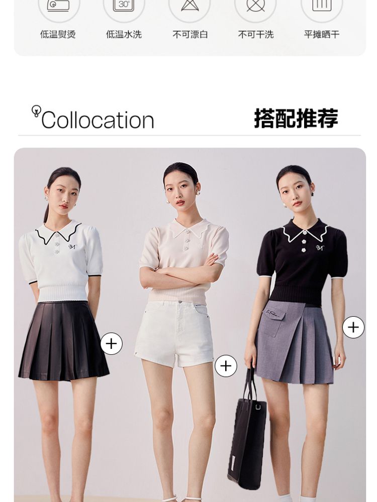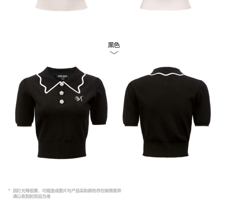 商品名称:【甜美通勤】翻领拼色泡泡袖刺绣短袖针织衫女 165329