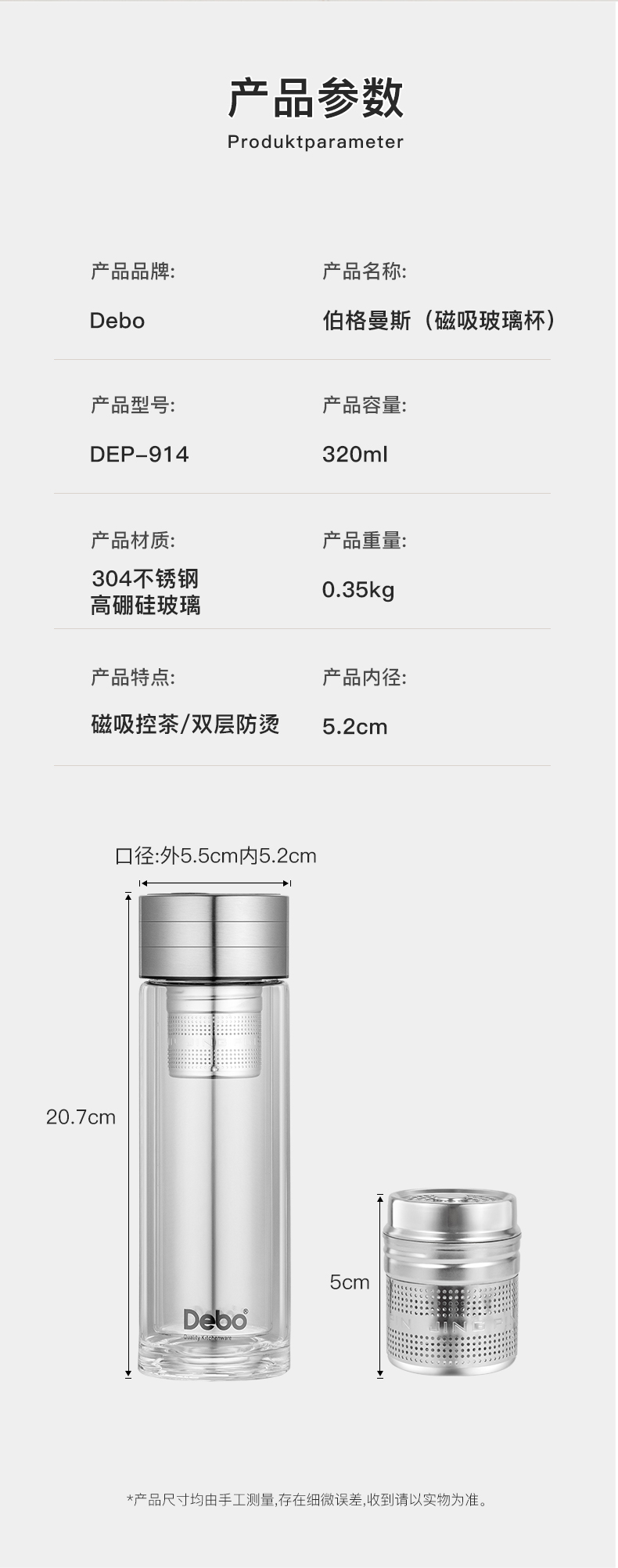 商品名称:Debo/德铂320毫升伯格曼斯磁吸玻璃杯DEP-914