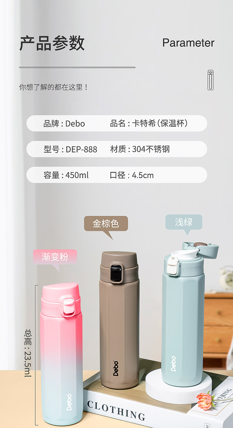 商品名称:Debo/德铂450毫升卡特希保温杯DEP-888