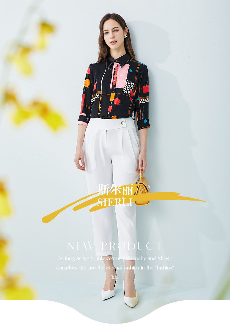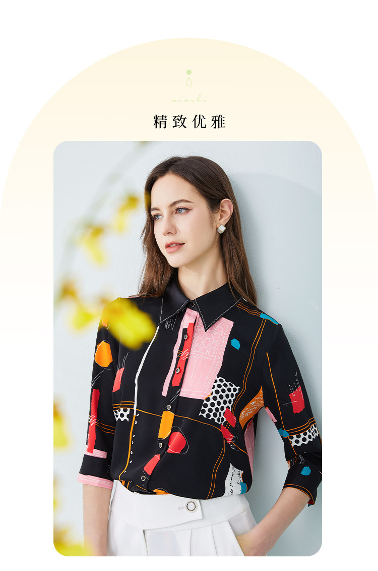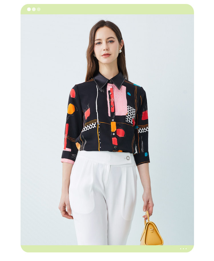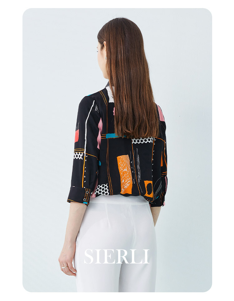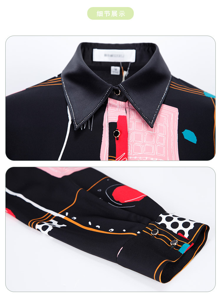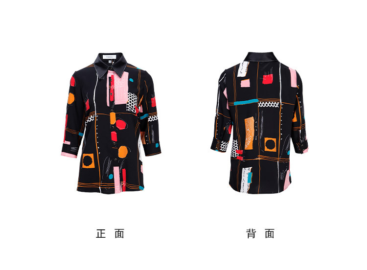 商品名称:商场同款春季不规则几何印花小众宽松翻领衬衣 010975