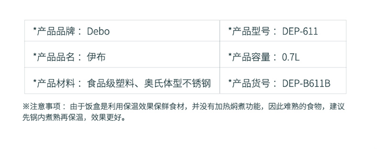 商品名称:Debo/德铂700毫升伊布单层饭盒DEP-611