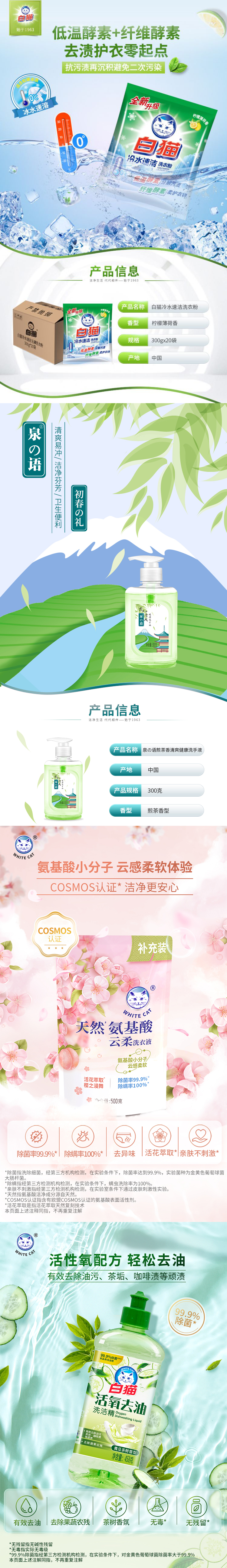 白猫冷水速洁无磷洗衣粉300g+白猫泉の语煎茶清爽健康洗手液300g+白猫天然氨基酸云柔洗衣液500g+白猫活氧去油洗洁精458g