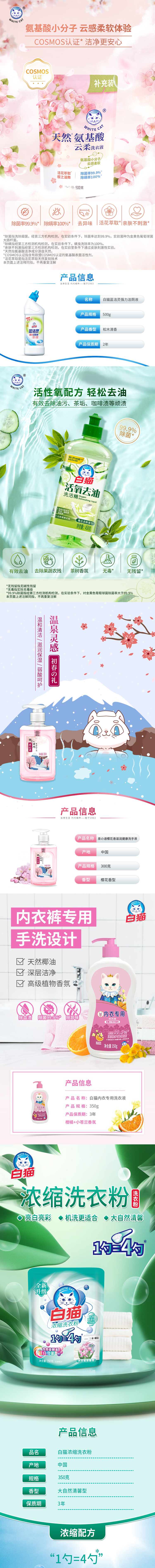 白猫天然氨基酸云柔洗衣液500g+白猫蓝洁灵强力洁厕液(弯头)500g+白猫活氧去油洗洁精458g+白猫泉の语樱花滋润健康洗手液300g+白猫内衣专用洗衣液350g+白猫新浓缩洗衣粉350g
