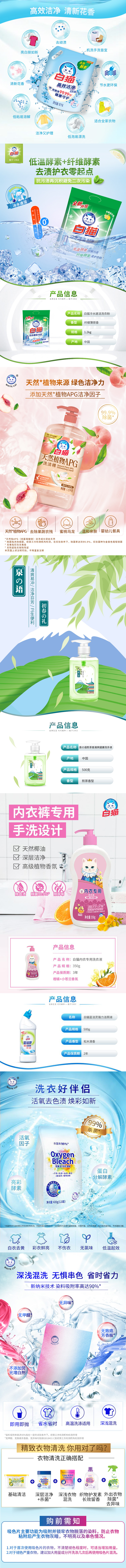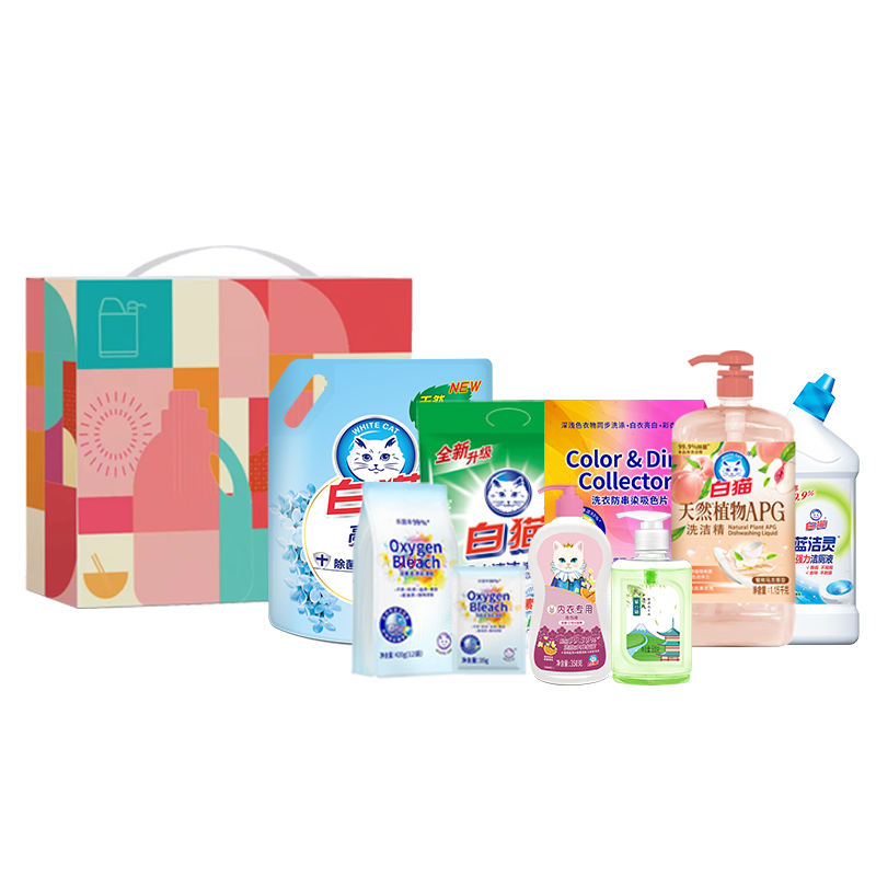 白猫高效洁净洗衣液1kg+白猫冷水速洁无磷洗衣粉1.2kg+白猫天然植物APG洗洁精1.15kg+白猫泉の语煎茶清爽健康洗手液500g(妆字版)+白猫内衣专用洗衣液350g+白猫蓝洁灵强力洁厕液(弯头)500g+白猫活氧去渍彩漂粉35g*12袋+白猫多功能清洁喷雾500ml或白猫洗衣防串染吸色片20片/包(随机不接受指定)