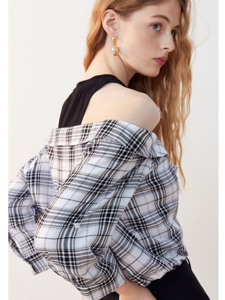【拼接假两件】春夏专柜款一字肩针织格纹衬衫气质百搭时尚 871121