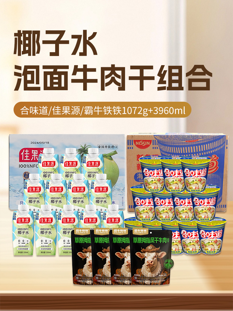 【京东/顺丰配送】合味道/佳果源/霸牛铁铁 牛肉干泡面椰子水组合1072g+3960ml