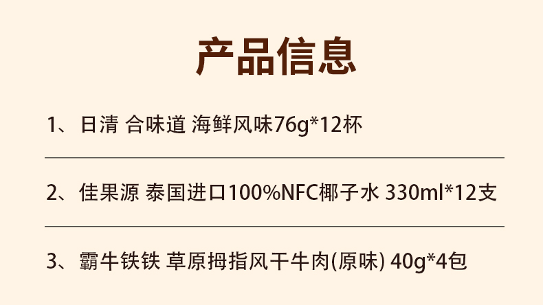 商品名称:【京东/顺丰配送】合味道/佳果源/霸牛铁铁 牛肉干泡面椰子水组合1072g+3960ml