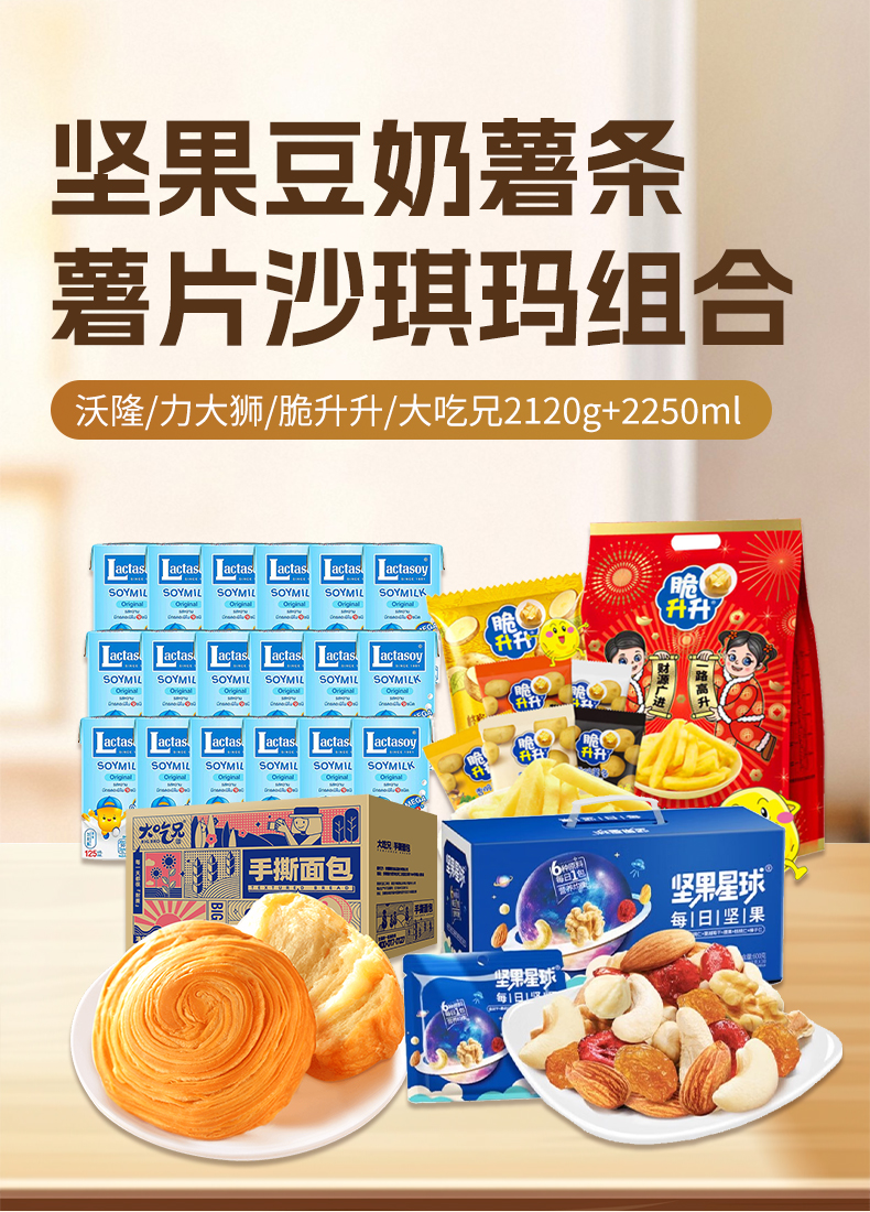 【京东/顺丰配送】沃隆/力大狮/脆升升/大吃兄 坚果糕点豆奶零食组合2120g+2250ml