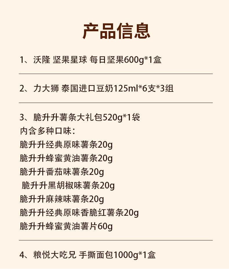 商品名称:【京东/顺丰配送】沃隆/力大狮/脆升升/大吃兄 坚果糕点豆奶零食组合2120g+2250ml