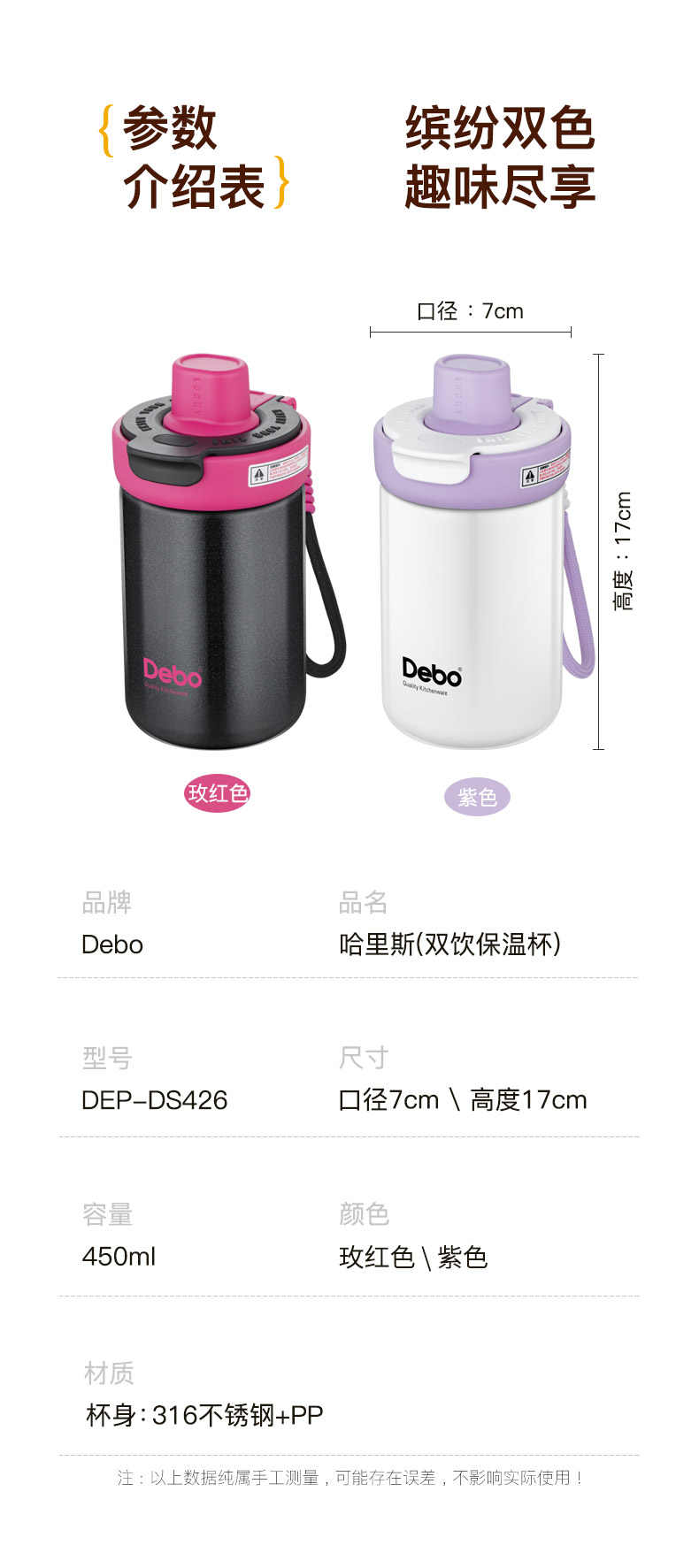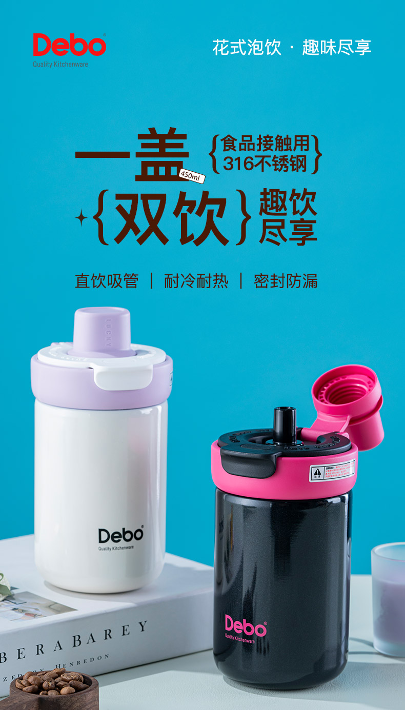 商品名称:Debo/德铂450毫升哈里斯双饮保温杯DEP-DS426