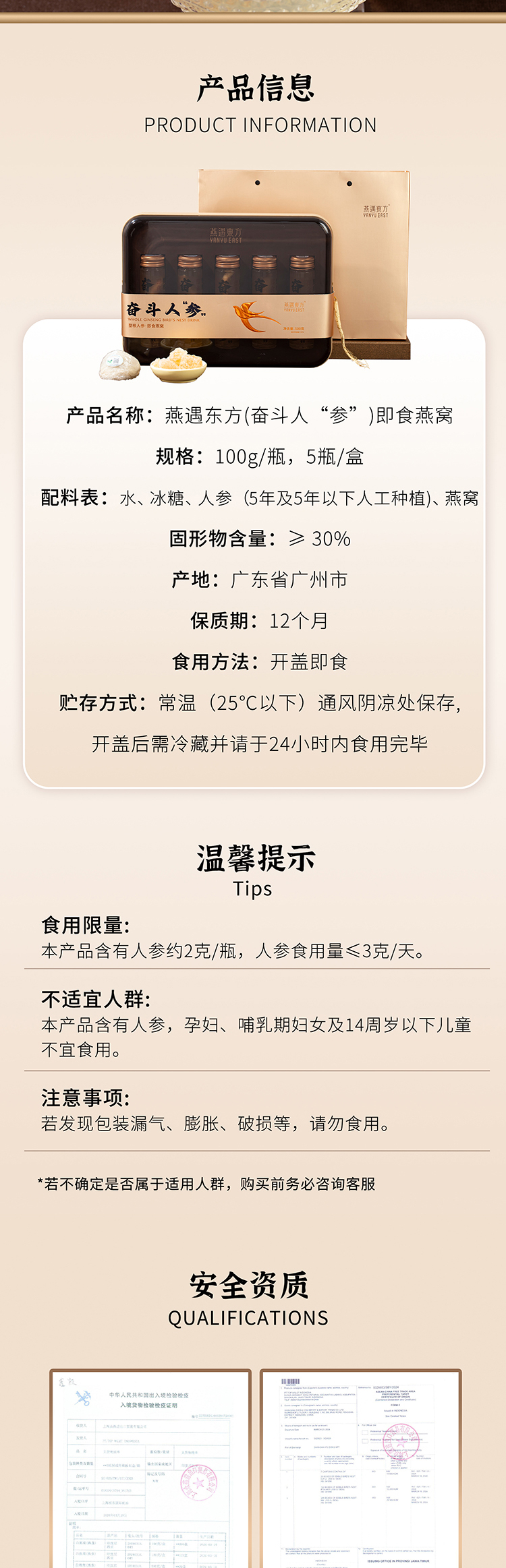 商品名称:燕遇东方奋斗人参即食燕窝礼盒100g*5瓶