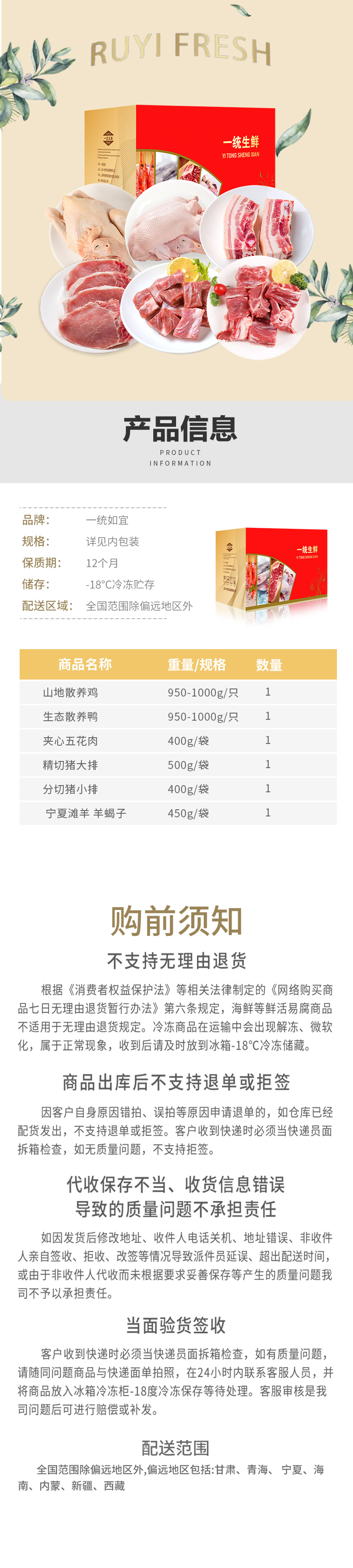 商品名称:【顺丰配送】一统如宜398型生鲜肉礼盒约3650g