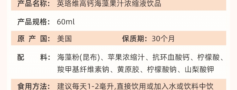 商品名称:英珞维(innovite)高钙海藻果汁浓缩液饮品 60ml