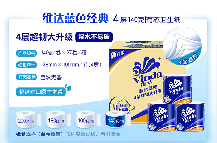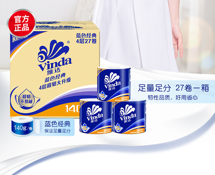 商品名称:Vinda/维达蓝色经典超韧有芯卷纸整箱140g*27卷