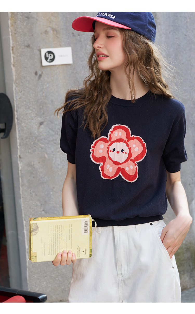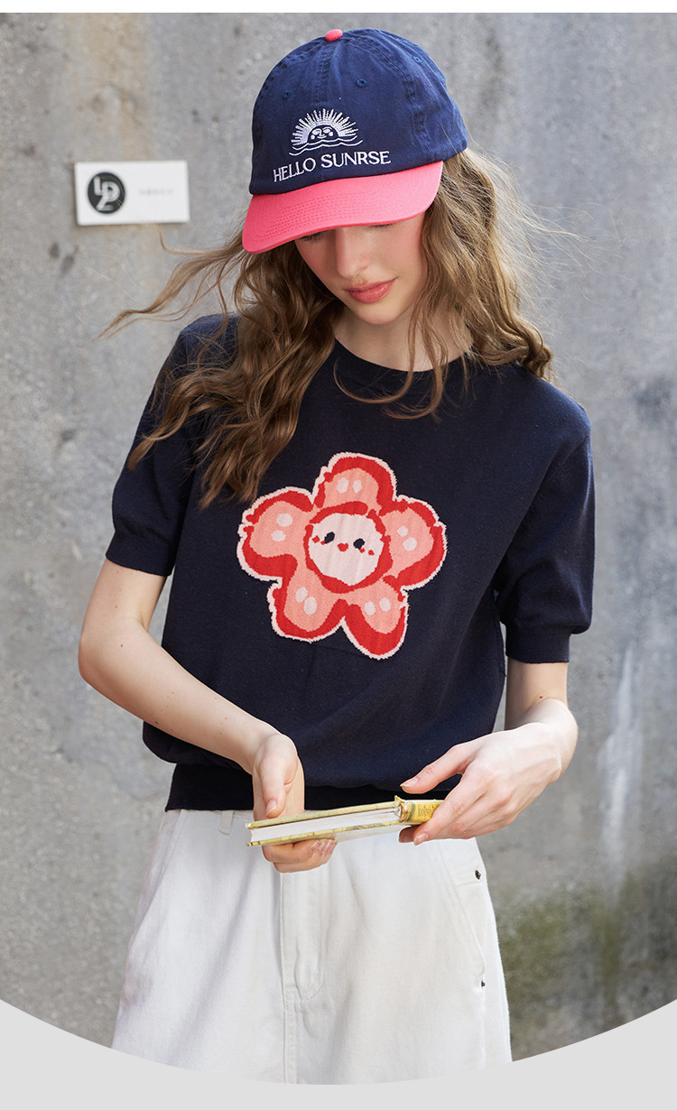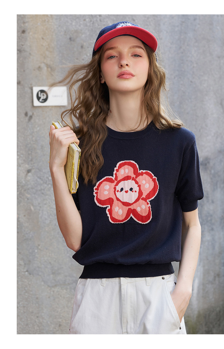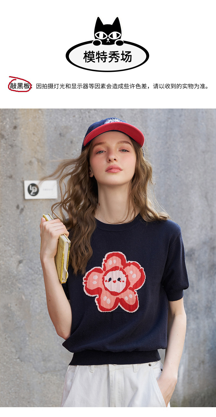 商品名称:复古圆领童趣提花针织短袖上衣2025夏季休闲百搭女式针织衫 948445