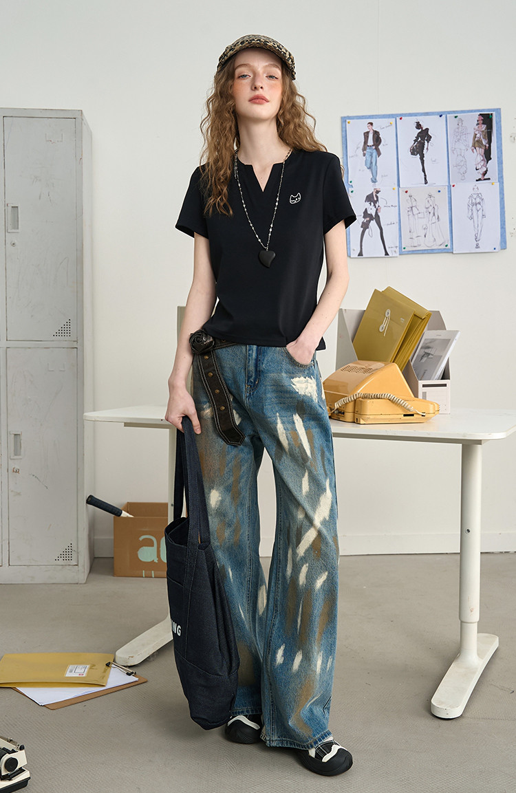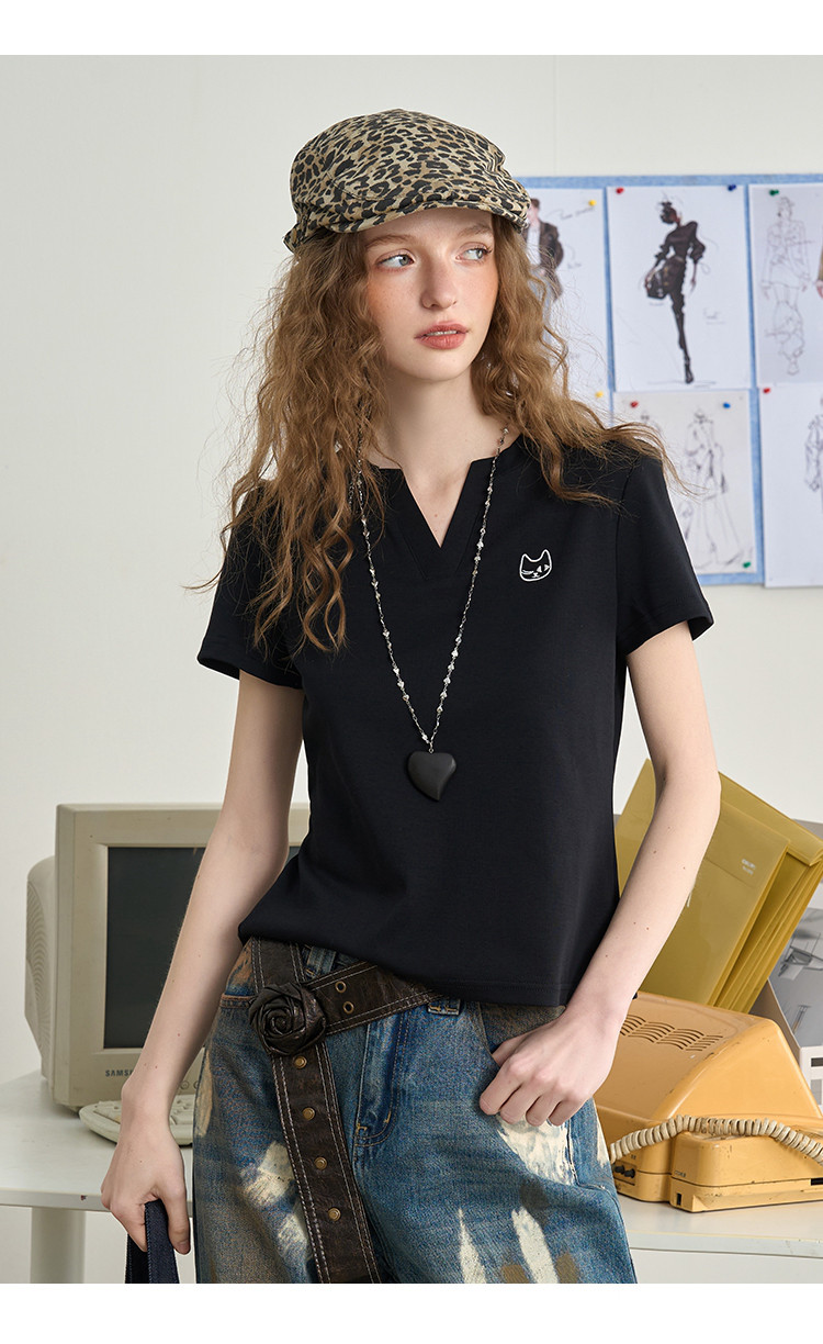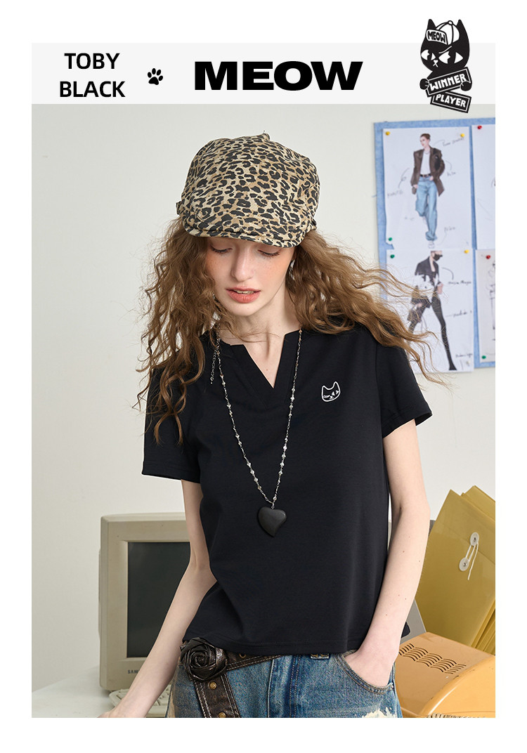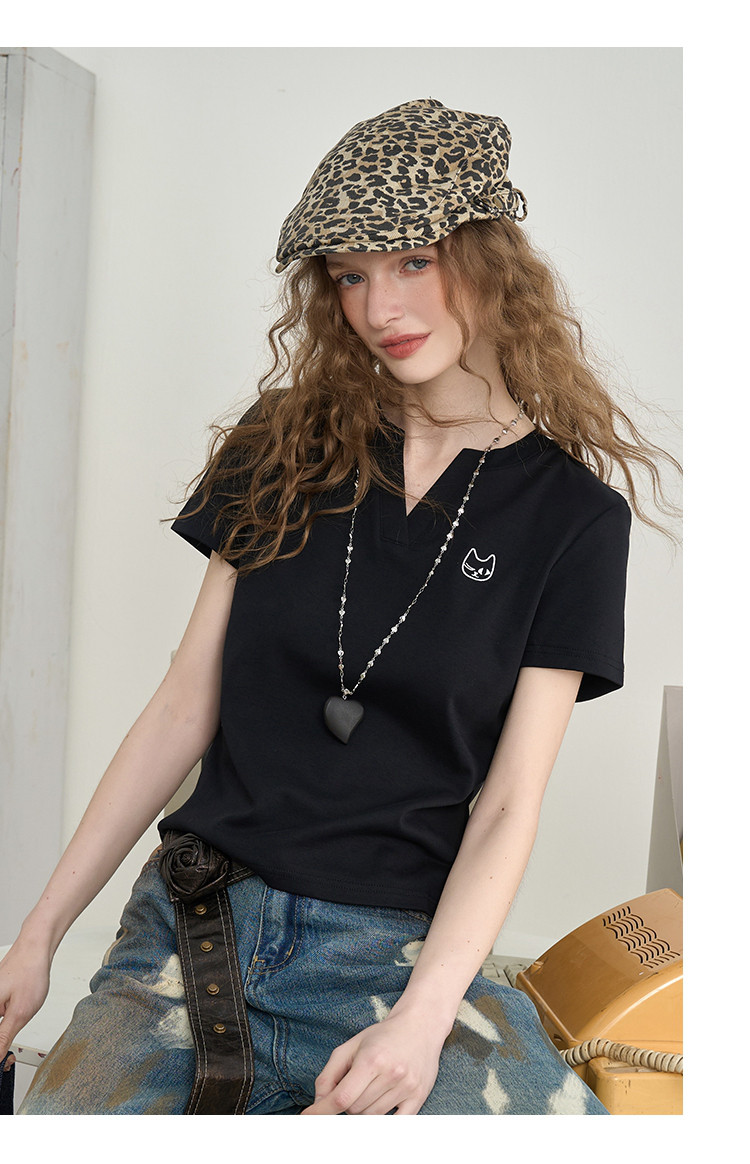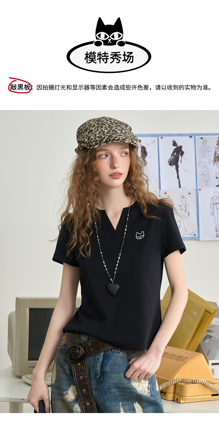 气质修身紧身小V领短款上衣2025夏季百搭休闲女式T恤 978973
