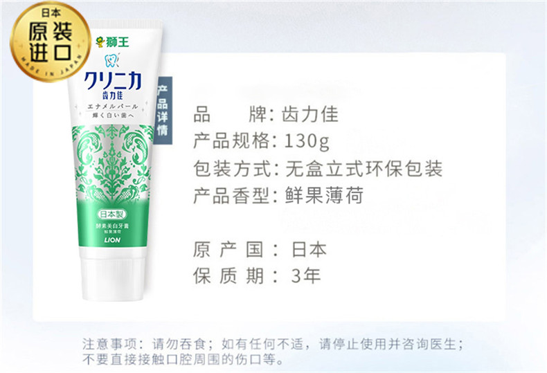 商品名称:Lion/狮王齿力佳酵素美白牙膏-鲜果薄荷130g