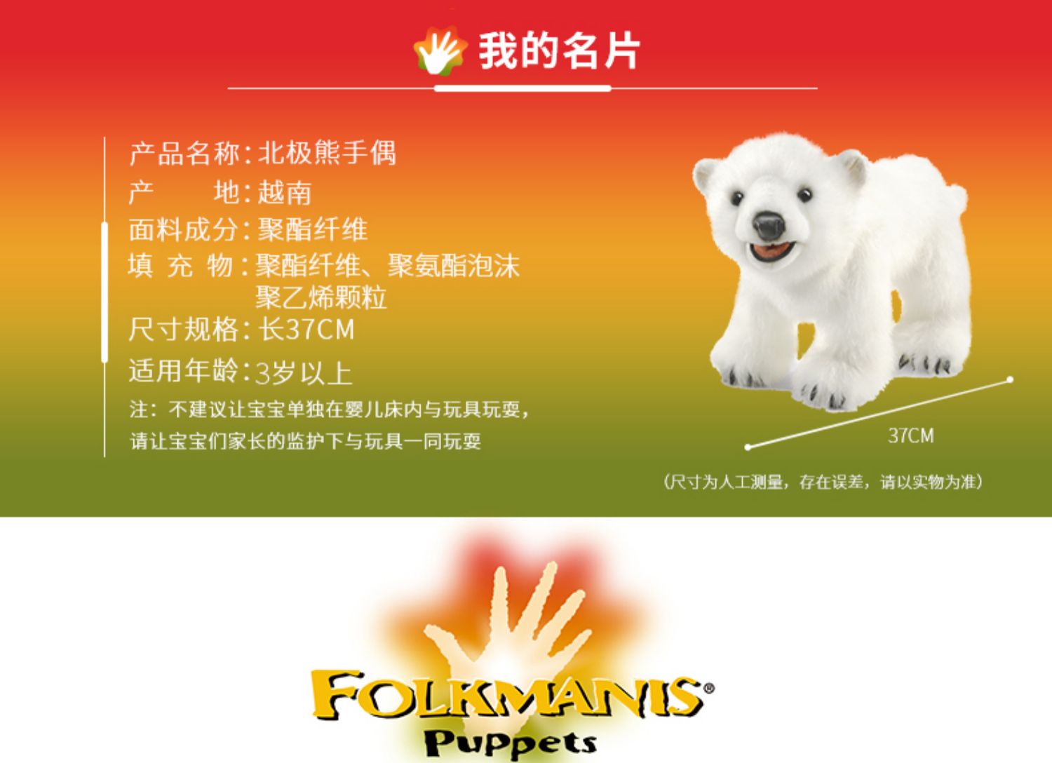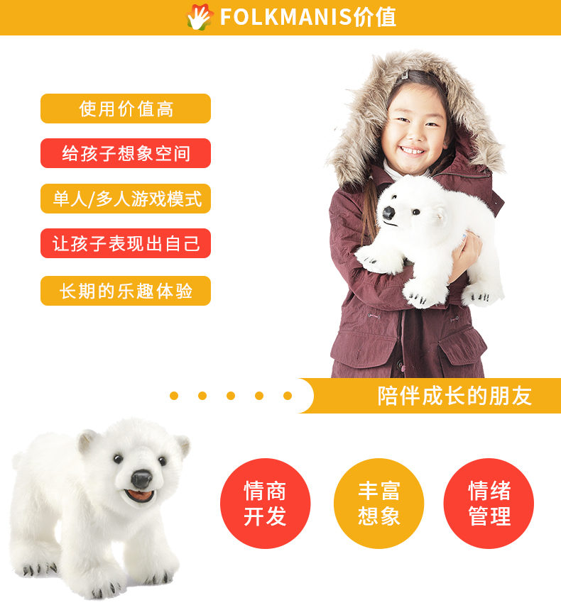 商品名称:福克曼尼斯/FOLKMANIS 仿真互动教育手偶北极熊宝宝手偶