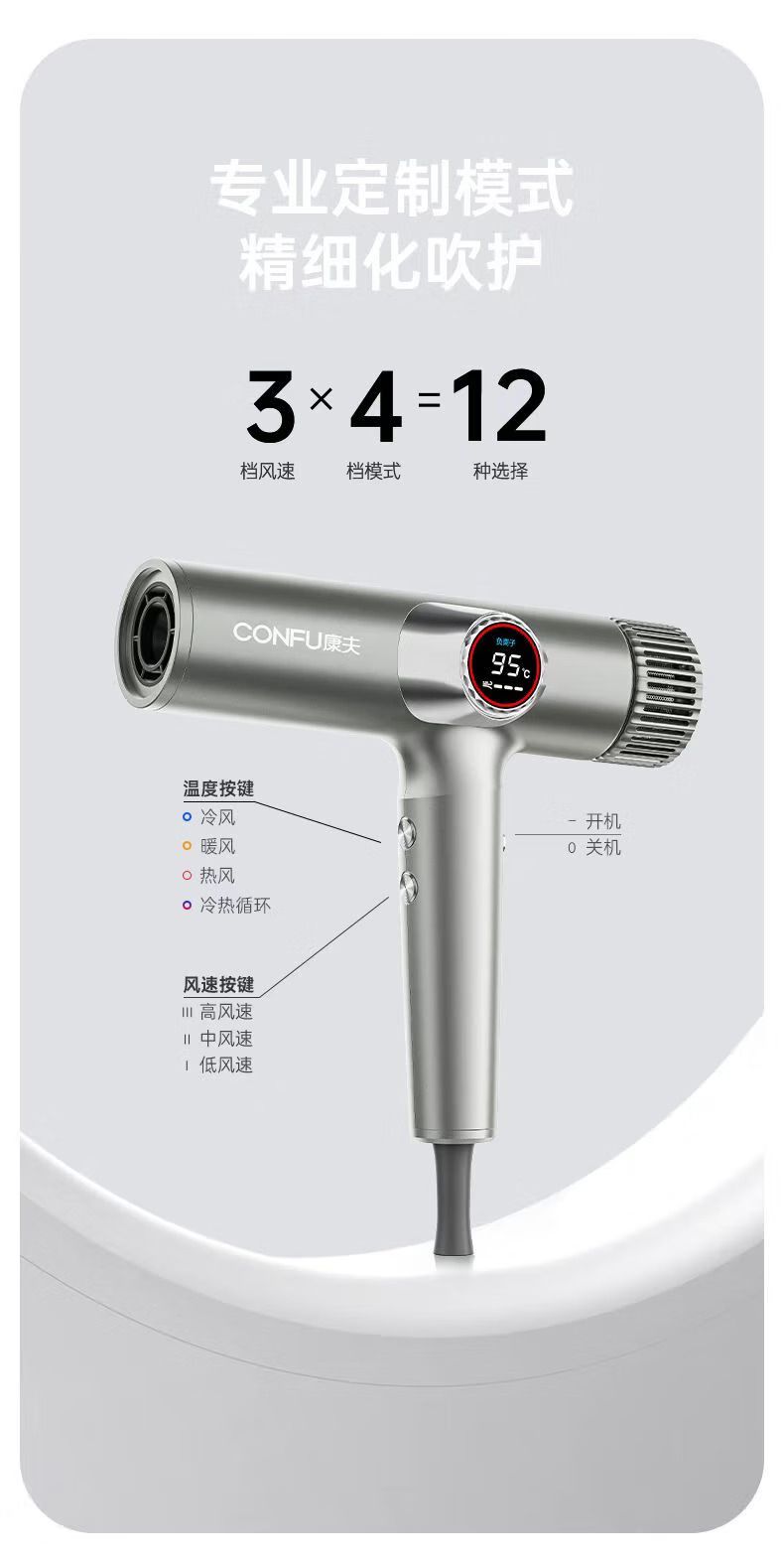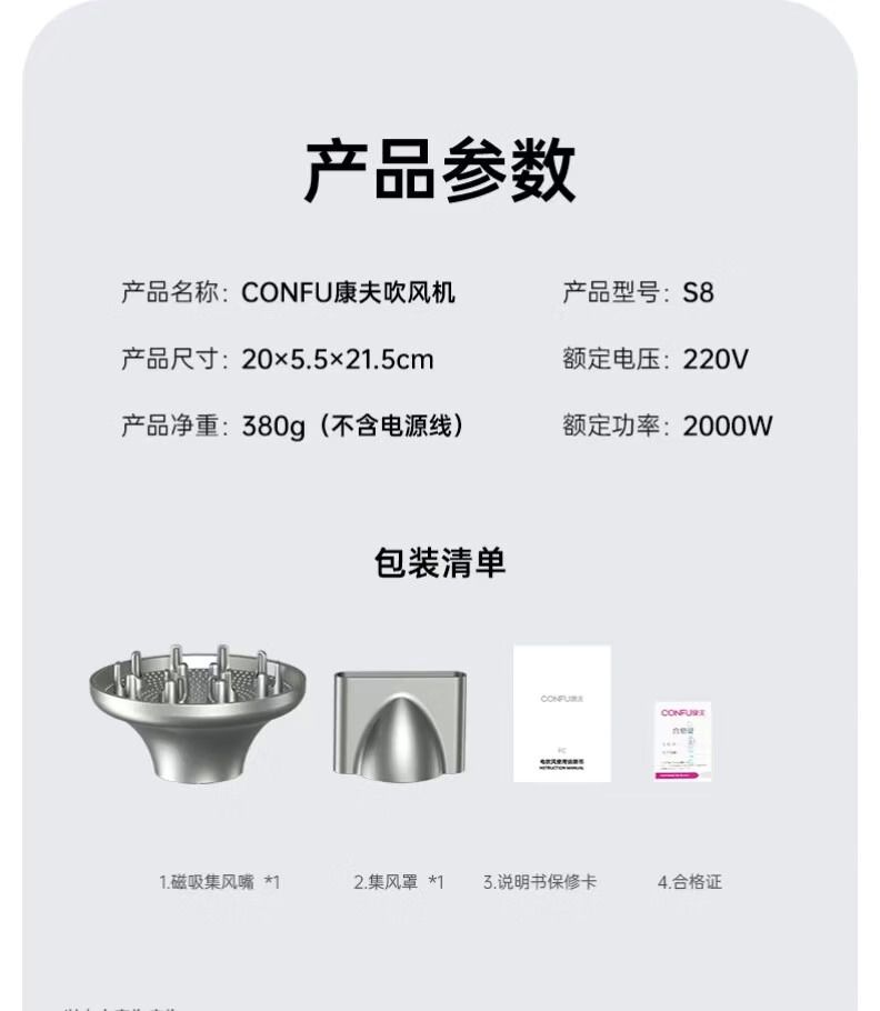 商品名称:康夫高速吹风机发廊理发师大功率护发速干静音负离子电吹风机 康夫S8专业版