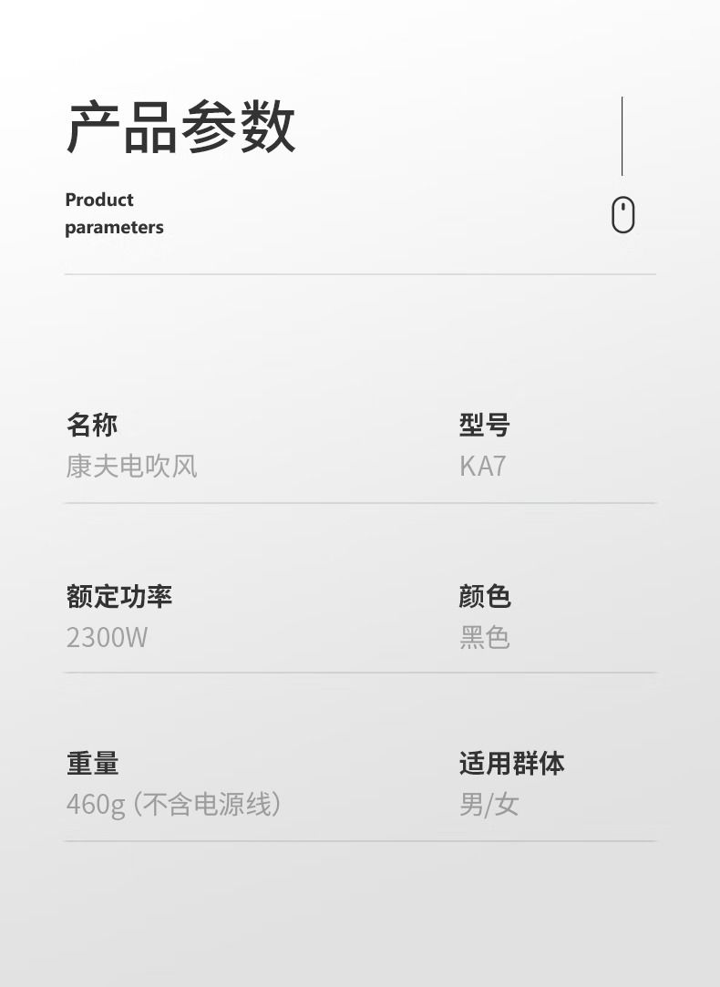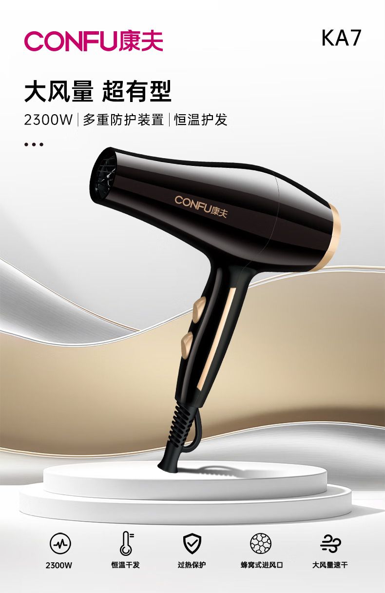 商品名称:康夫家用电吹风机2300W大功率恒温护发 强劲大风力速干发廊理发店吹风筒 KA7
