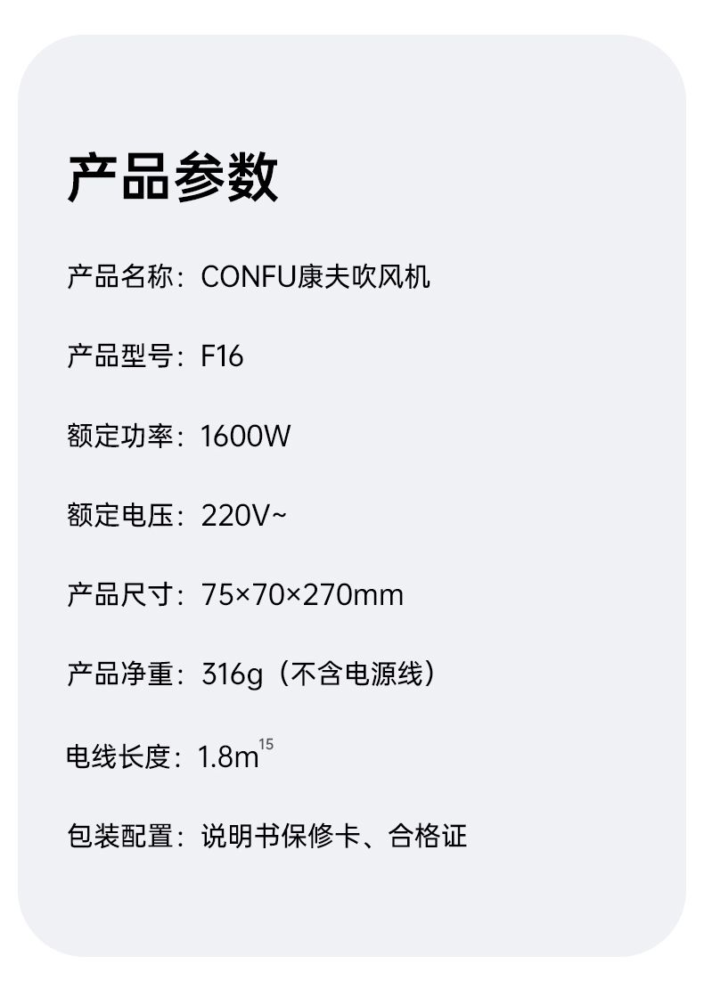 商品名称:康夫负离子高速电吹风机筒F16家用大功率负离子护发