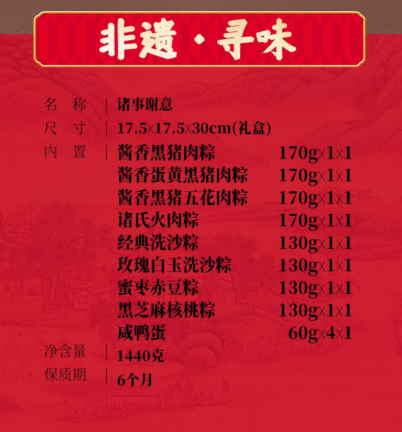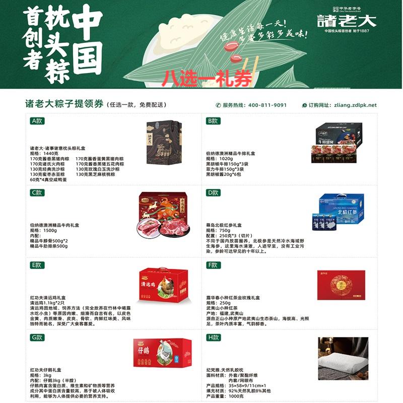 商品名称:〖八选一礼券〗诸老大诸事谢意枕头粽礼盒1440g 提货券(139型) 端午节礼盒