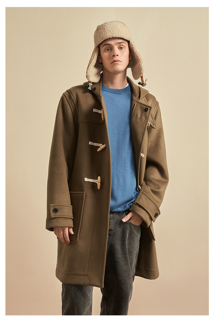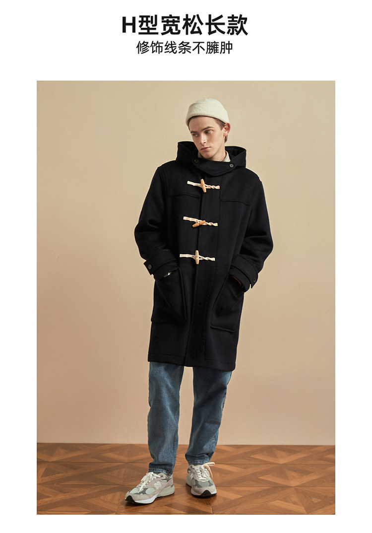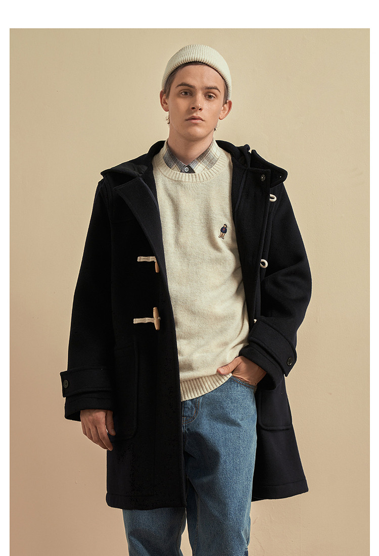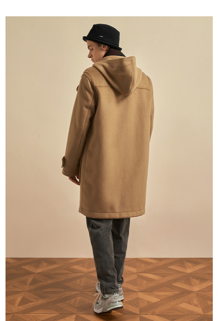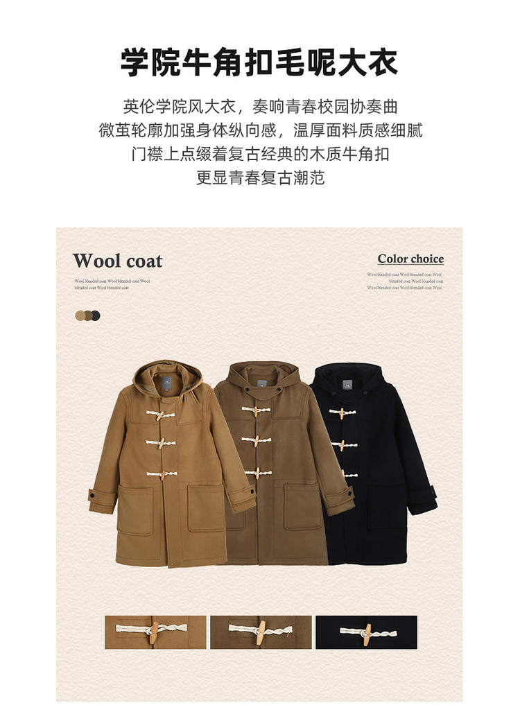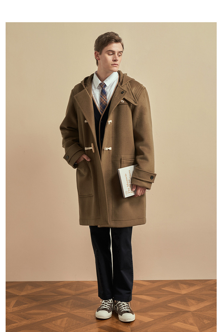 商品名称:小熊男装秋季学院牛角扣连帽毛呢外套男大衣男 202113