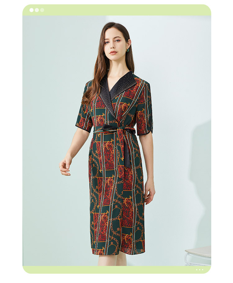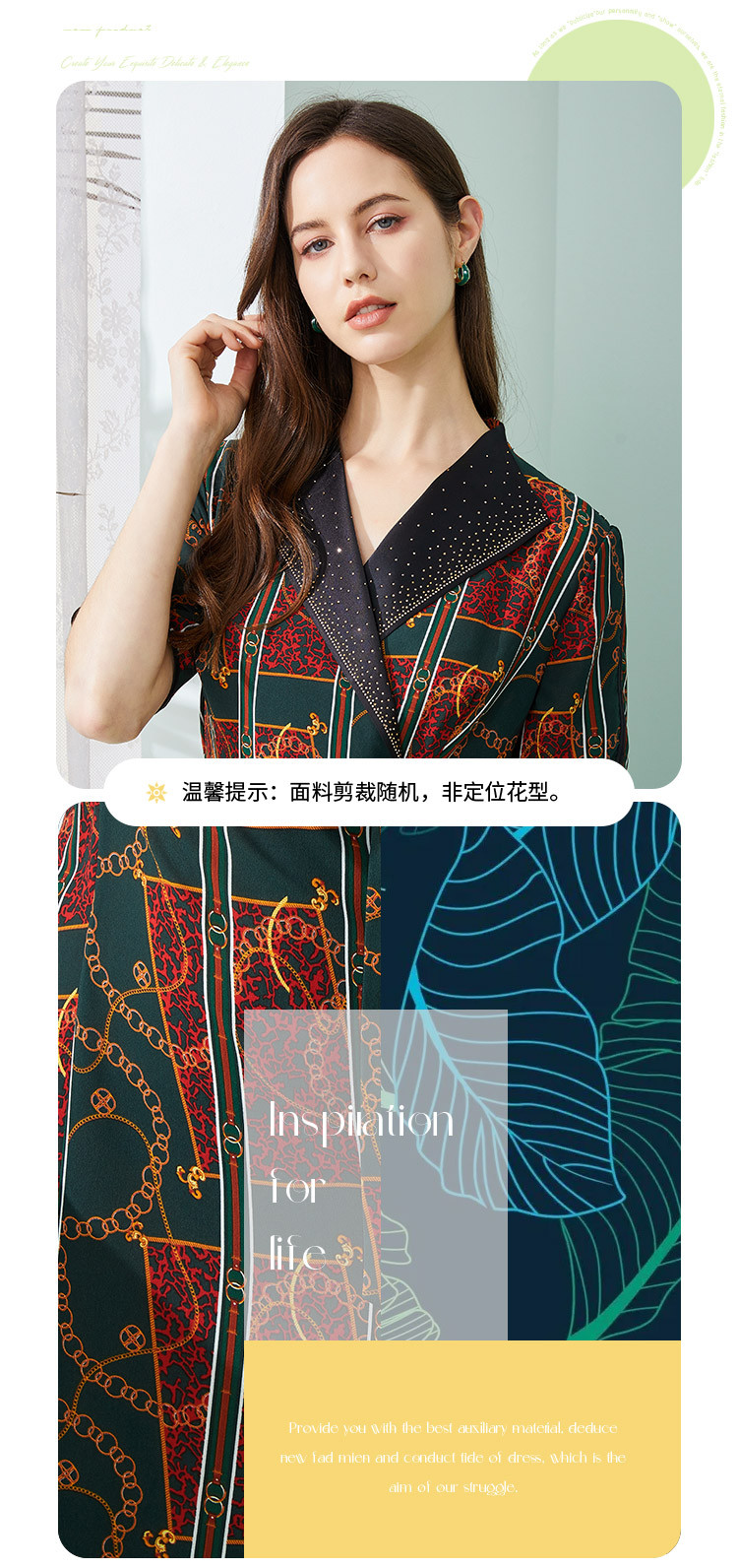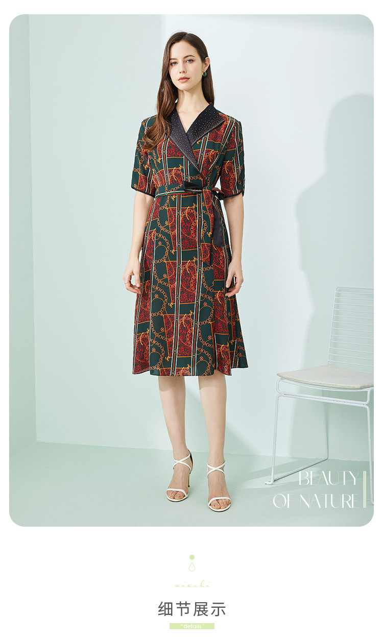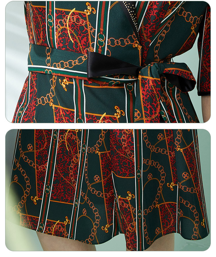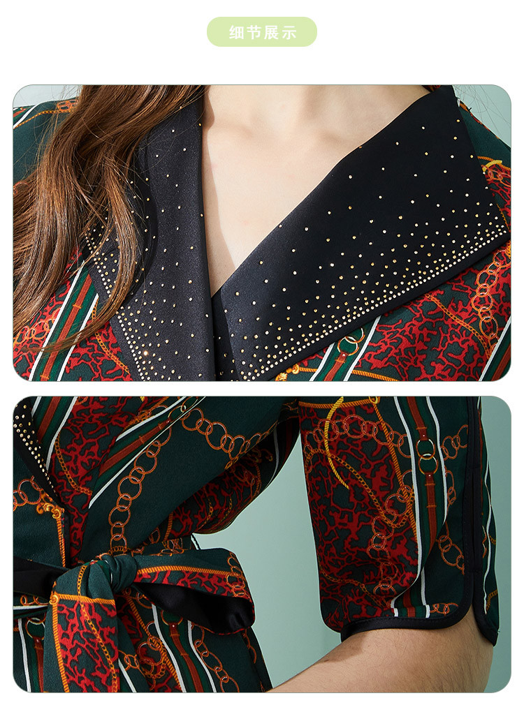 商品名称:商场同款秋季复古巴洛克金链油画印花撞色烫钻西装领优雅连衣裙 151135