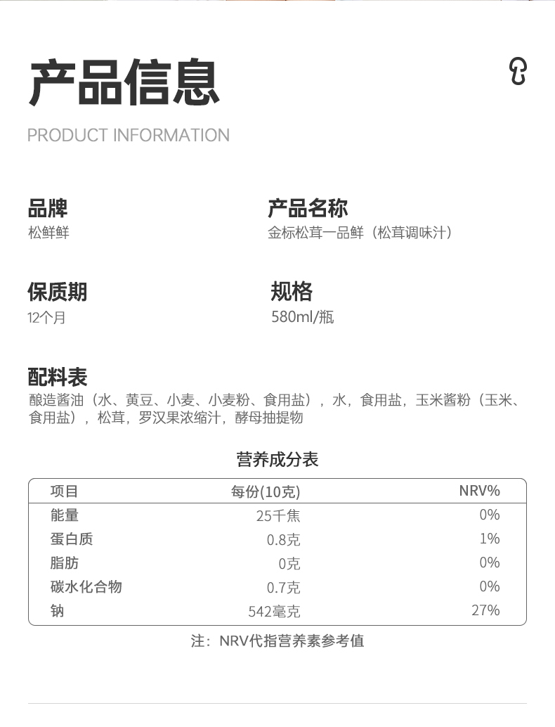 商品名称:松鲜鲜金标松茸一品鲜酱油580g*3瓶