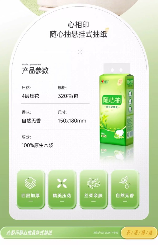 商品名称:心相印茶语精选320抽4提四层悬挂式提装面巾纸