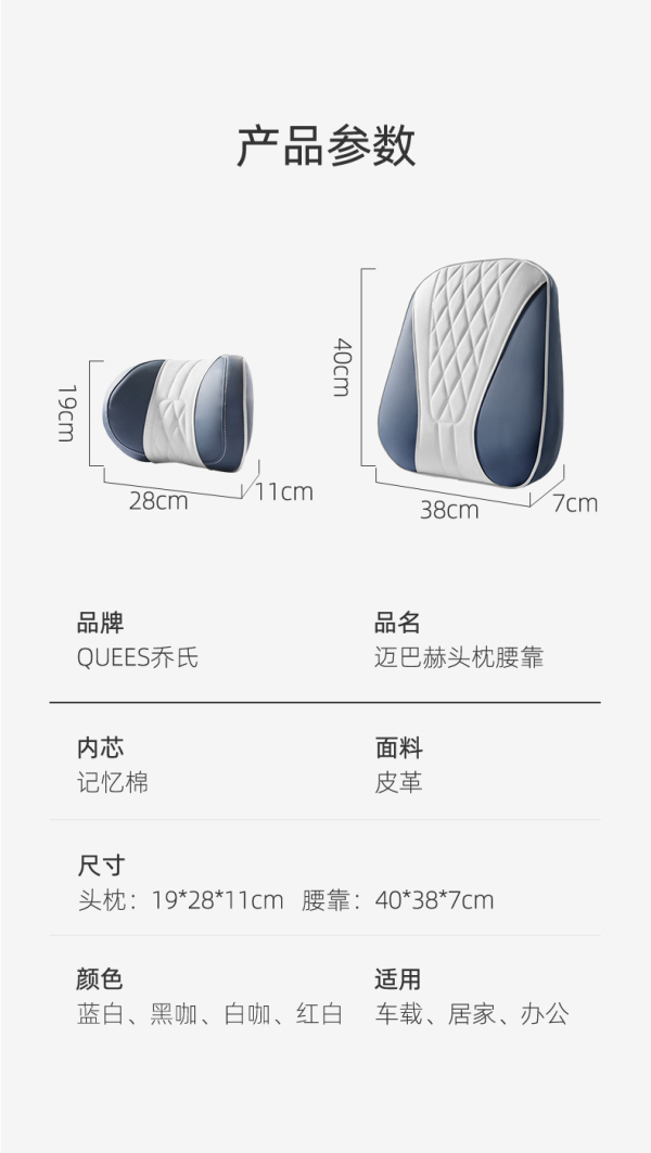 商品名称:乔氏迪柔系列汽车头枕护颈枕皮革车用座椅靠垫腰靠迈巴赫奔驰车内靠枕颈枕