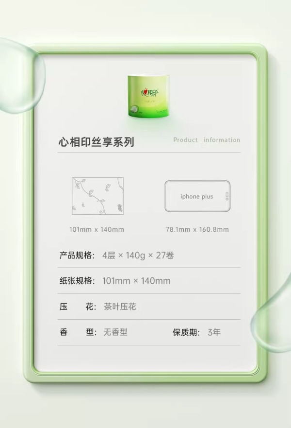商品名称:BT927心相印茶语丝享140克27粒装四层茶叶压花卷筒卫生纸
