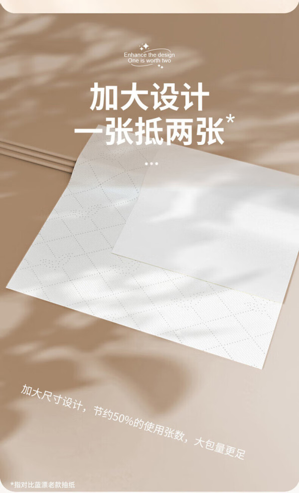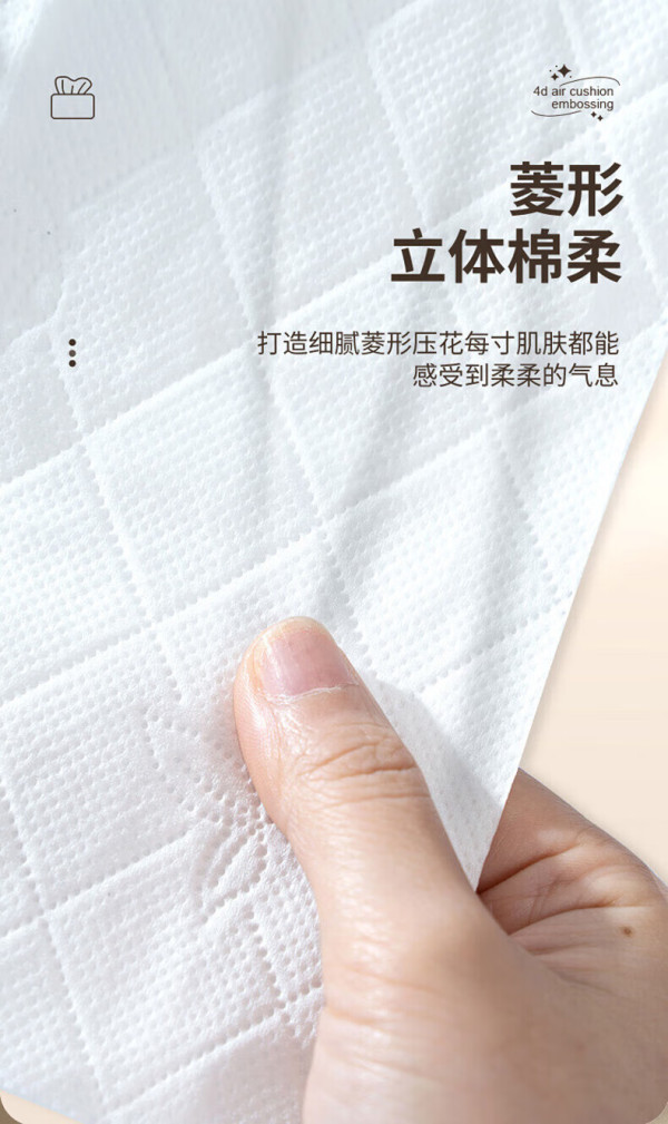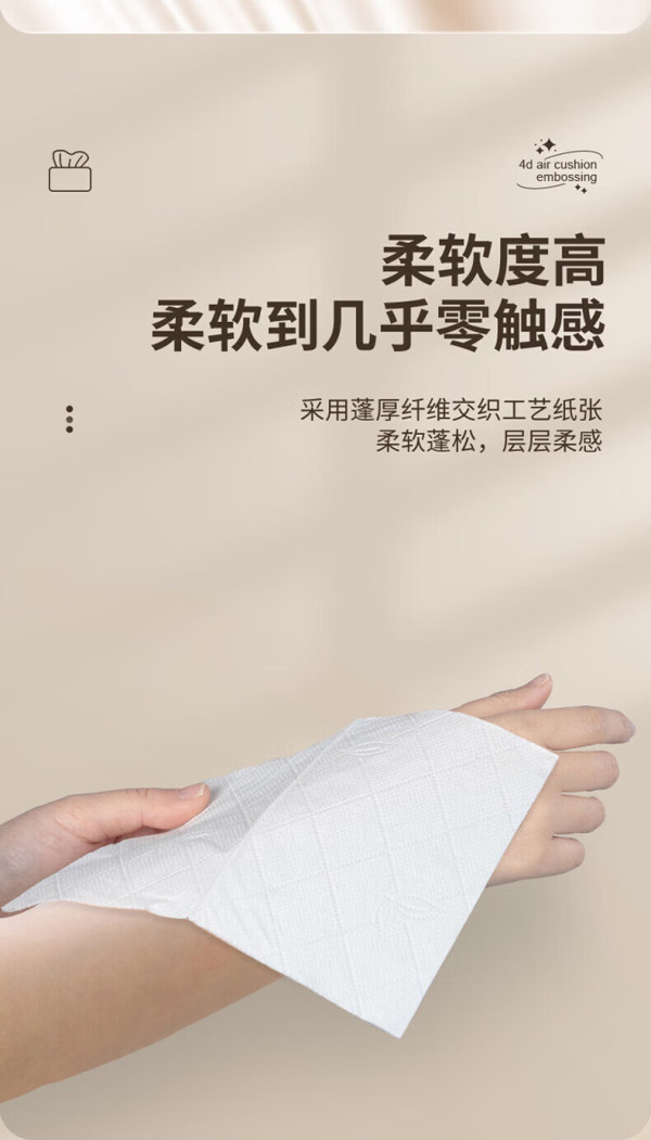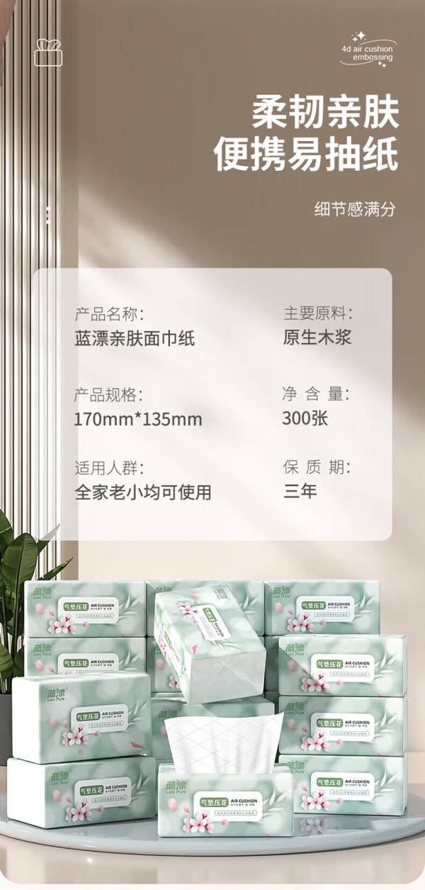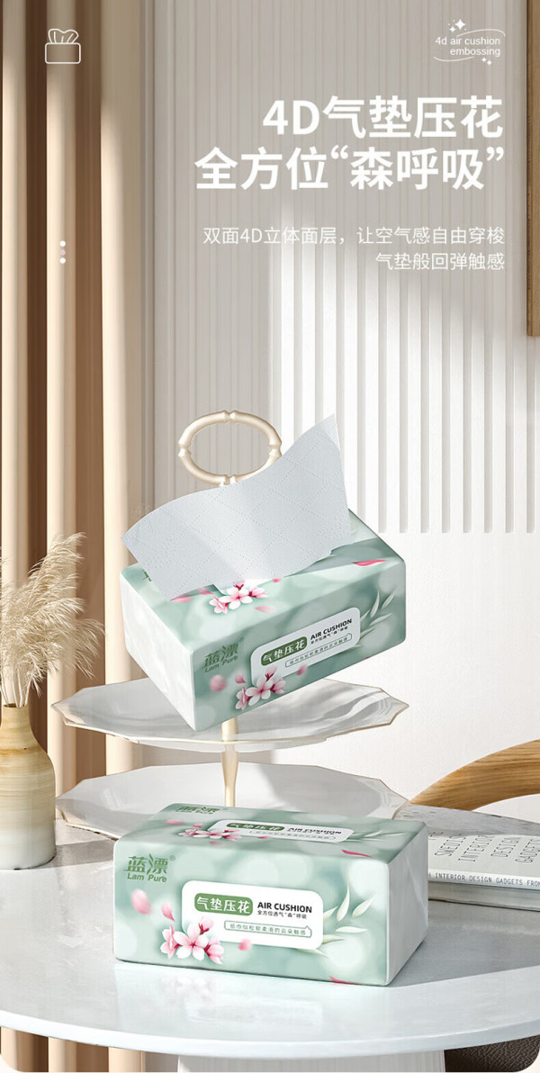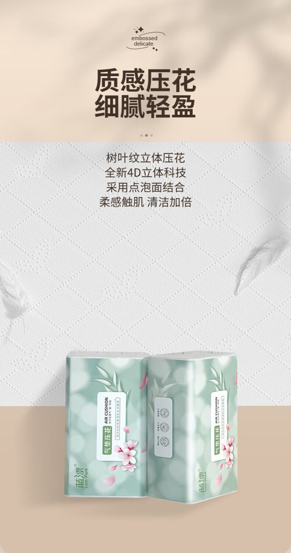 商品名称:蓝漂白色气垫压花抽纸6包黑色提袋装