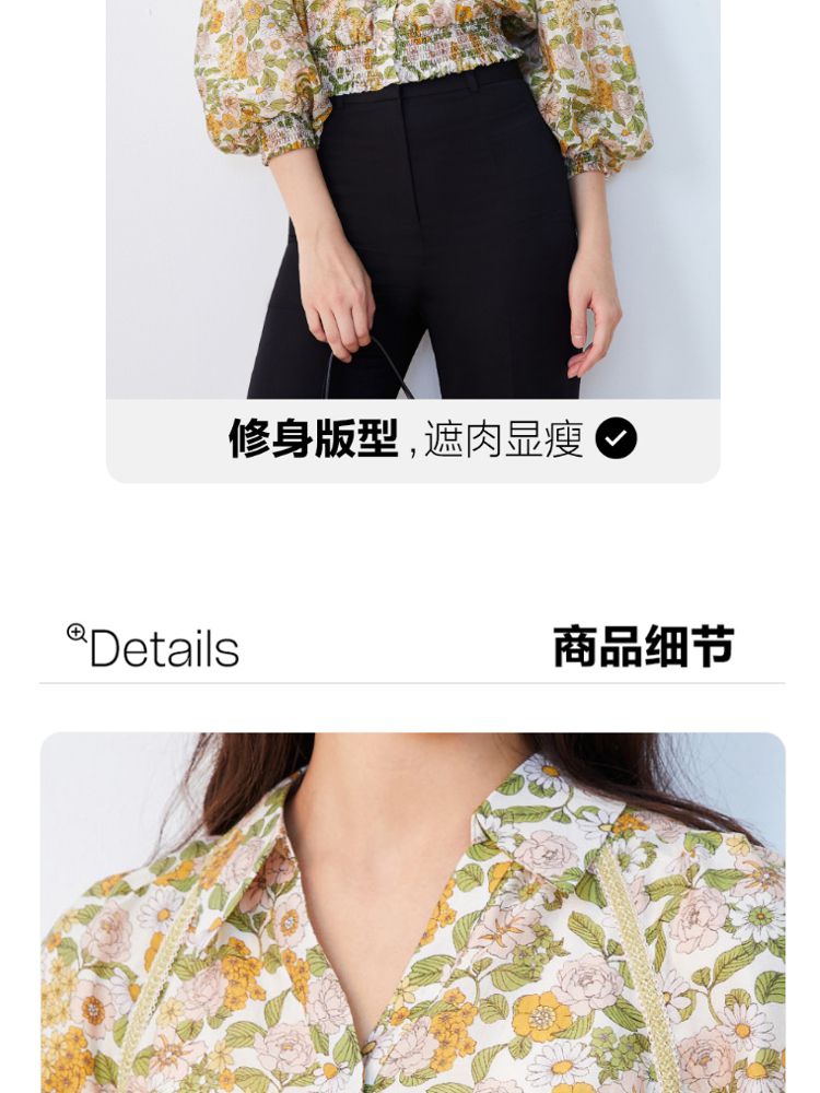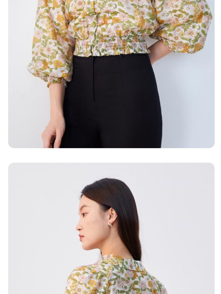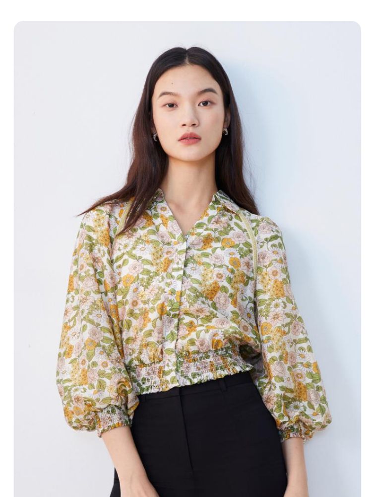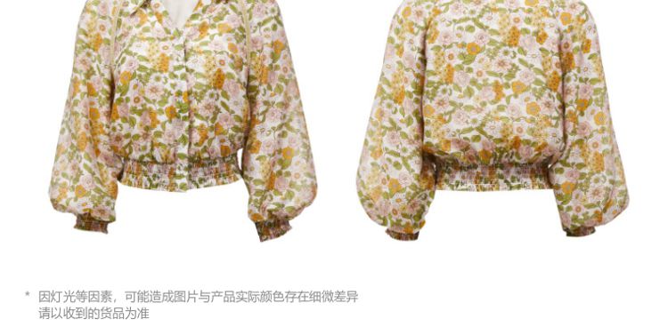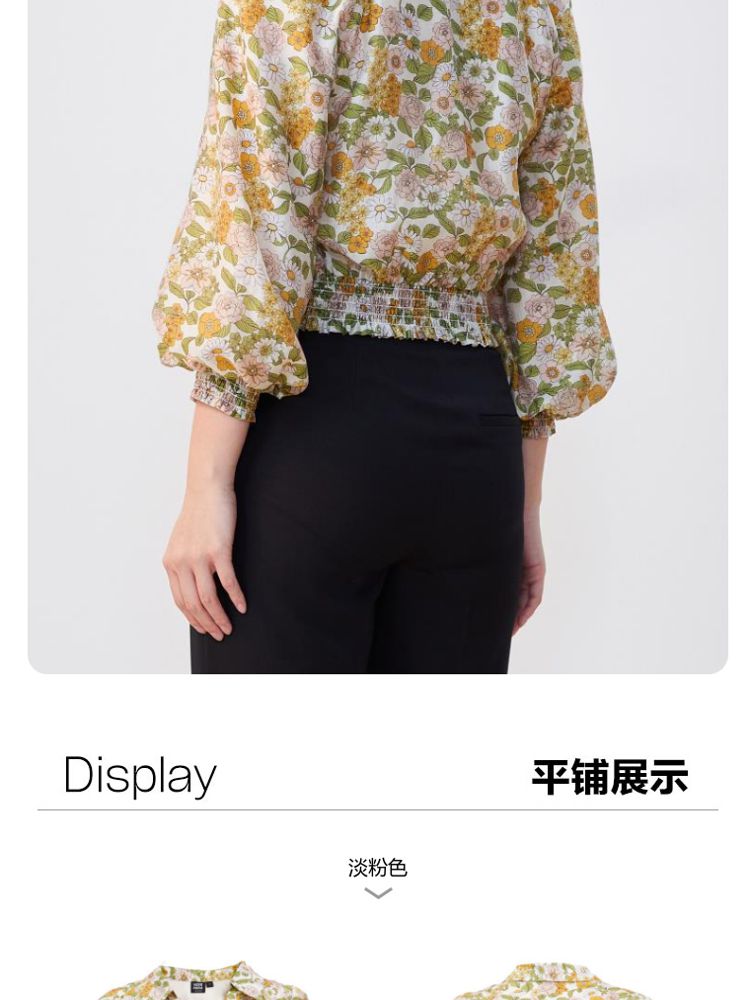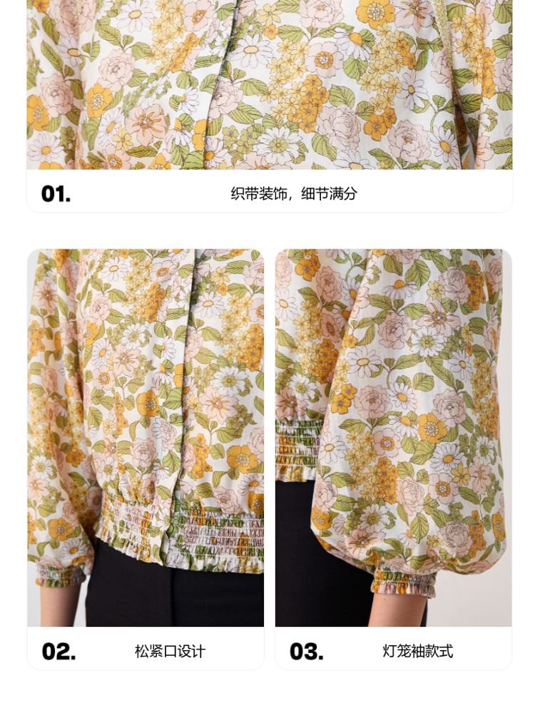 商品名称:【天丝柔软】春秋专柜款花朵灯笼袖V领松紧腰上衣女 971025