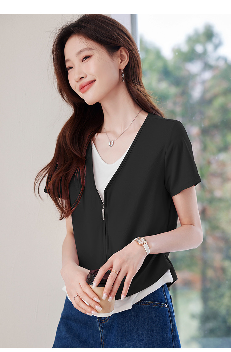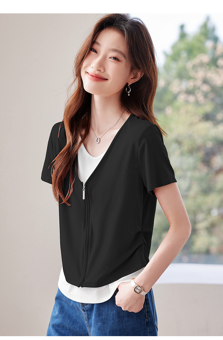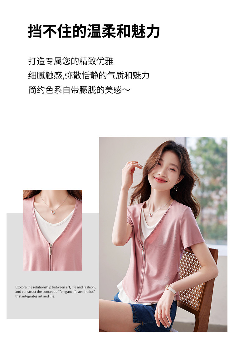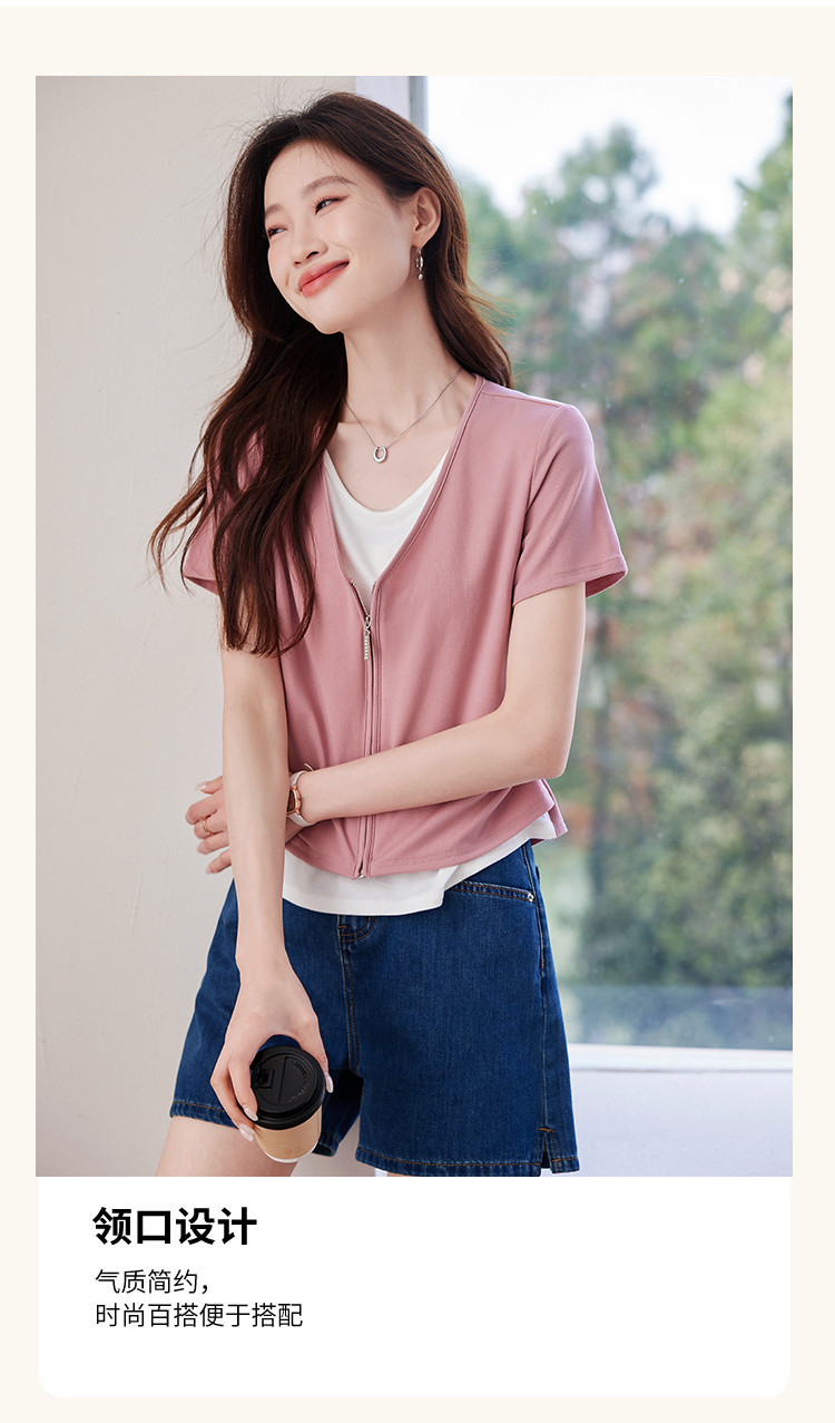 【莱赛尔t恤】假两件设计感短袖T恤女夏季2025拼色针织t恤 795039