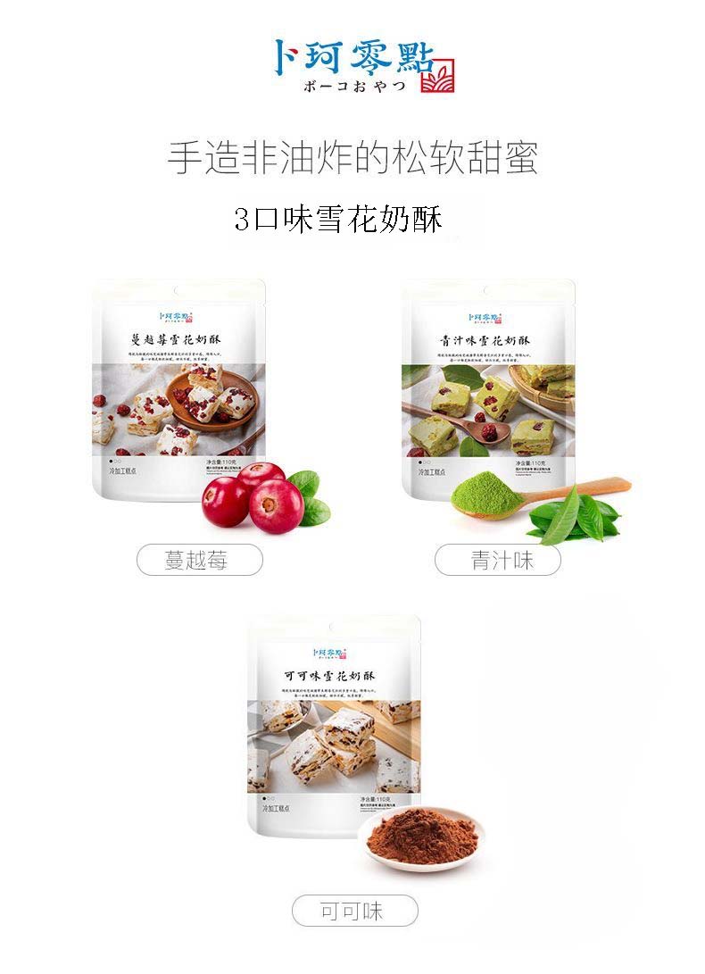 商品名称:卜珂零點雪花奶酥蔓越莓+可可味+青汁味三种口味组合装110g*3袋