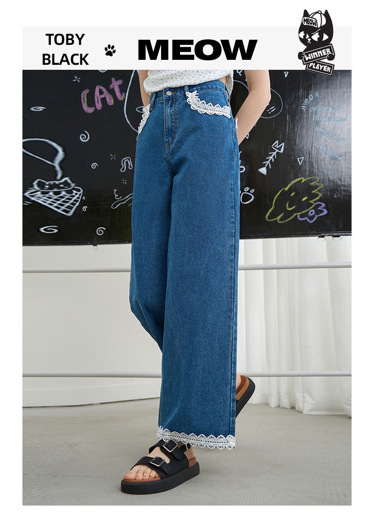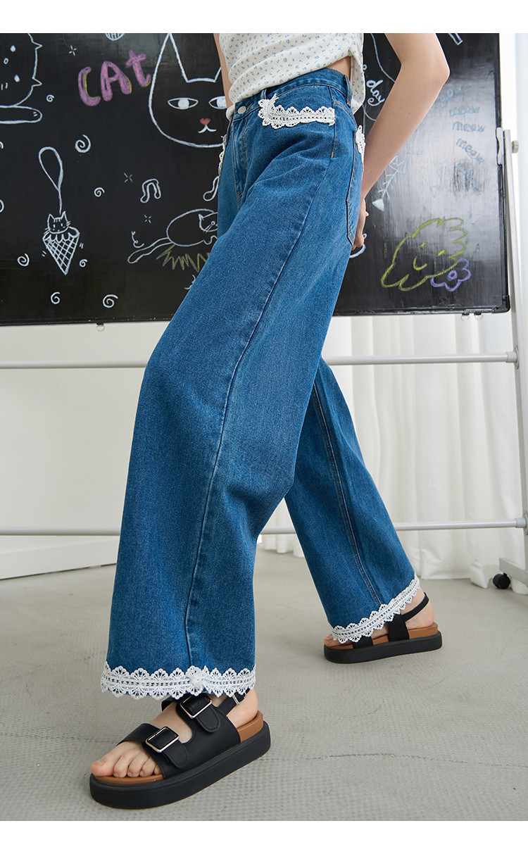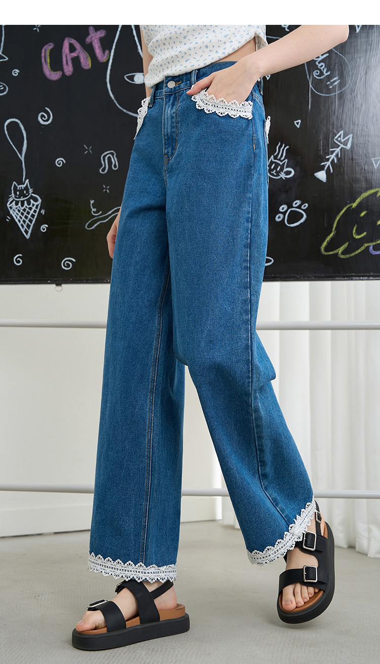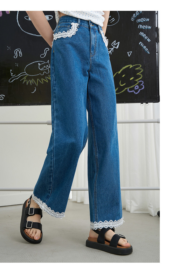 商品名称:韩版百搭花边蕾丝日系宽松阔腿裤2025夏季高腰显瘦女式牛仔裤 848733