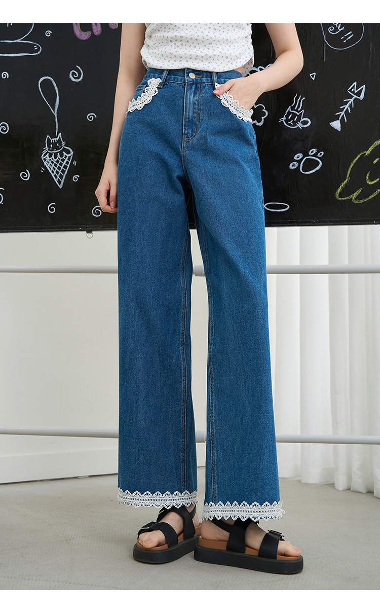 韩版百搭花边蕾丝日系宽松阔腿裤2025夏季高腰显瘦女式牛仔裤 848733