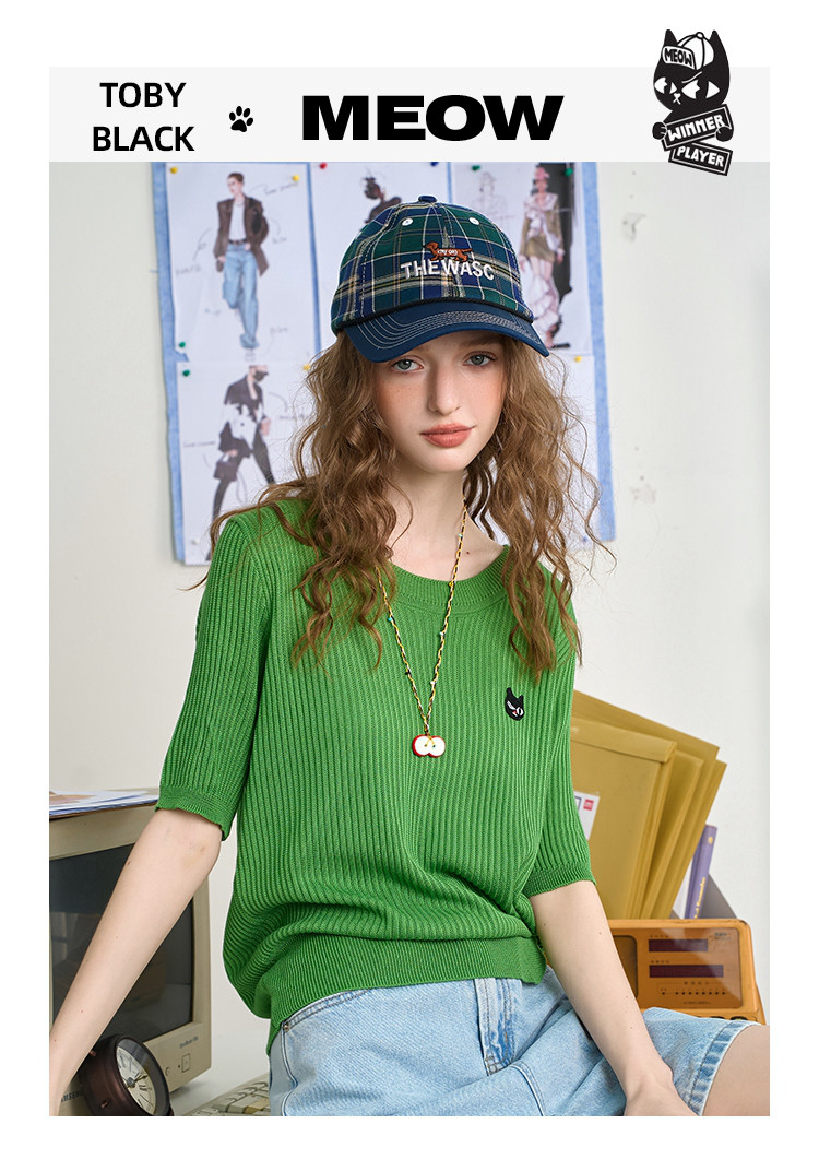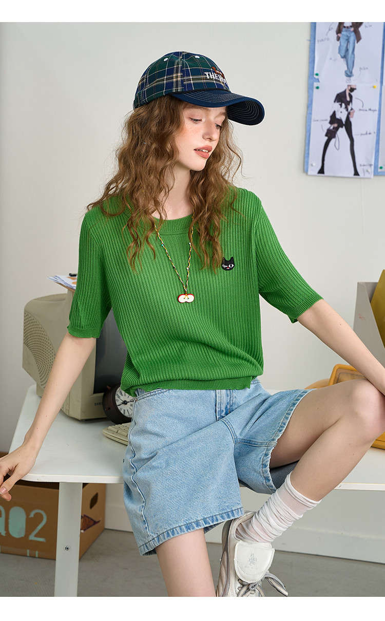 商品名称:圆领气质薄款宽松正肩短袖上衣2025夏季休闲百搭女式针织衫 360989