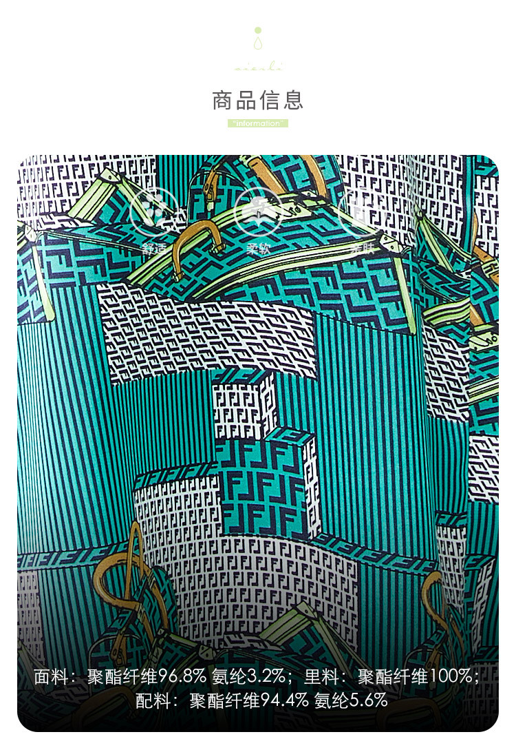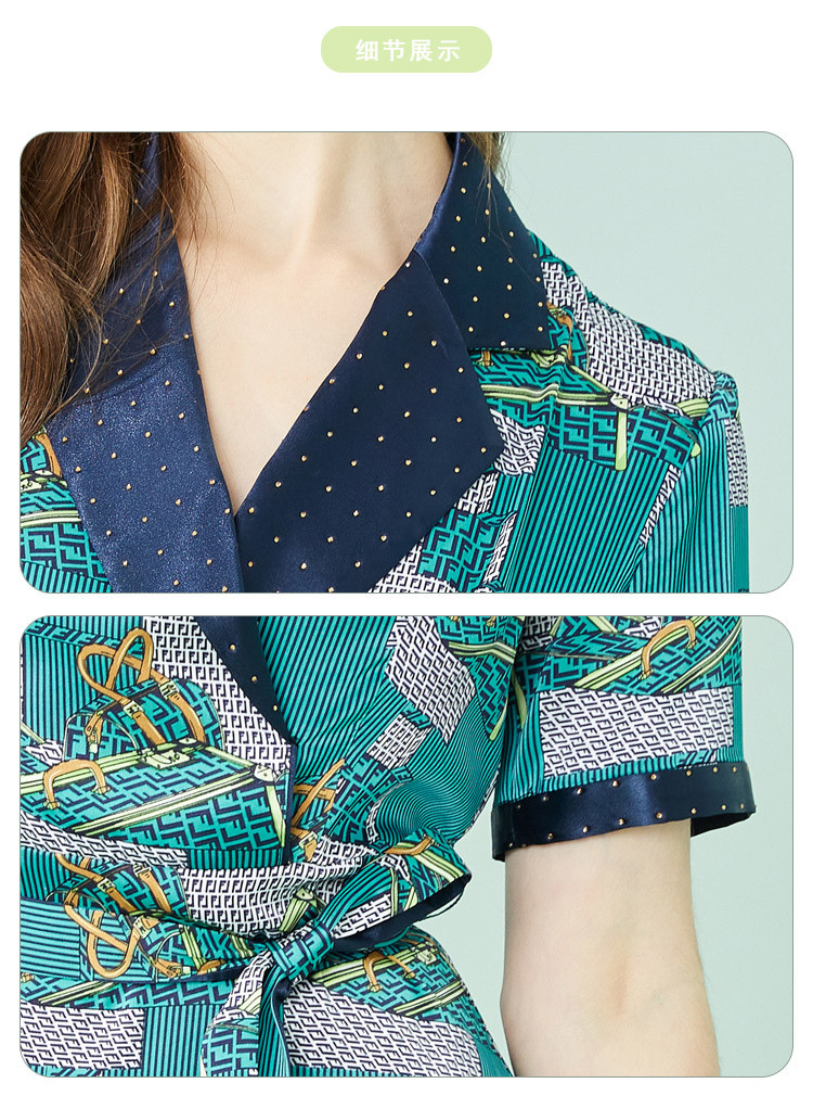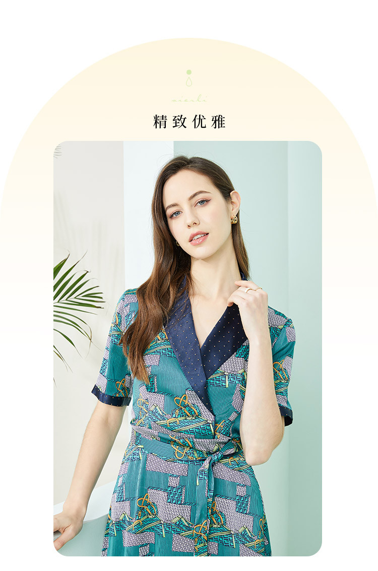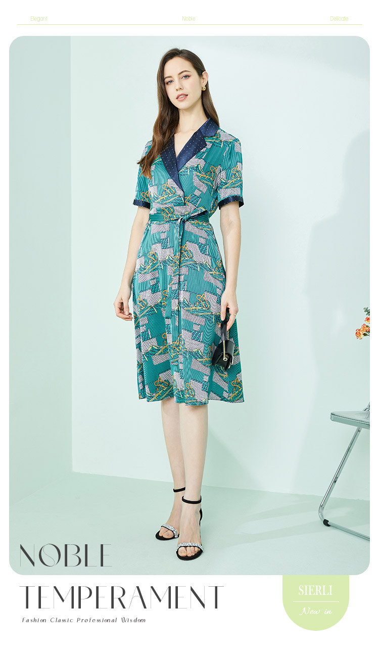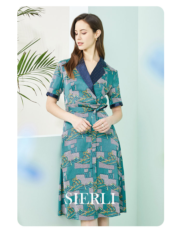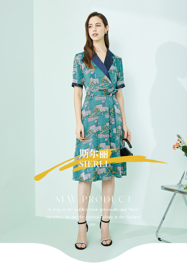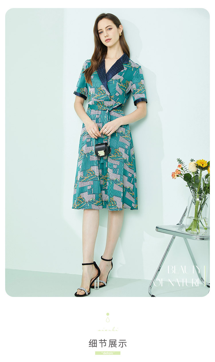 商品名称:商场同款春夏季复古中国风抽象印花烫钻翻领收腰式连衣裙 881439
