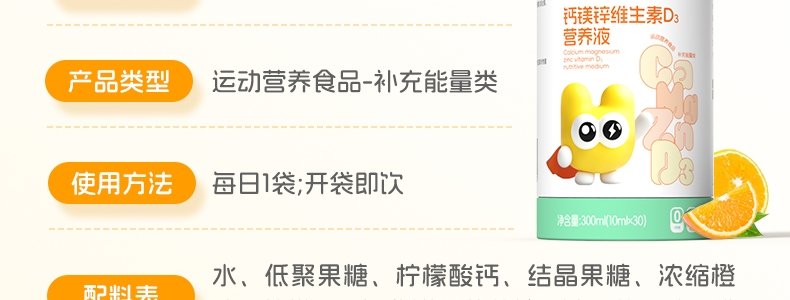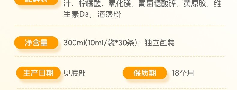 商品名称:优普贝 钙铁镁锌d3营养液 10ml*30条