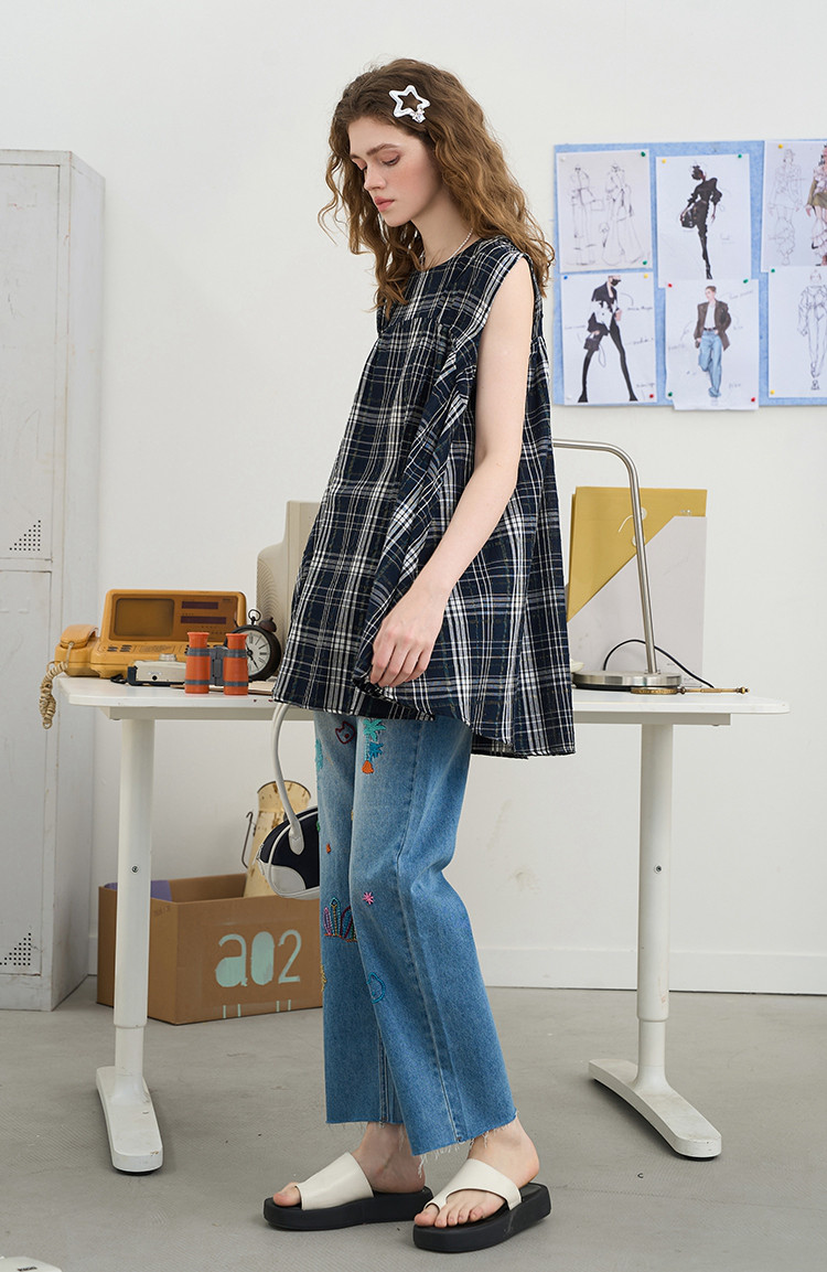 日系格子无袖娃娃衫背心衬衣2025夏季百搭休闲女式衬衫 698845