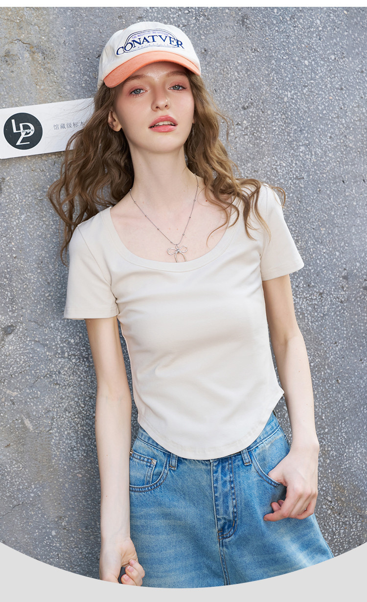 多巴胺色系U领修身短袖上衣2025夏季百搭休闲女式T恤 388381