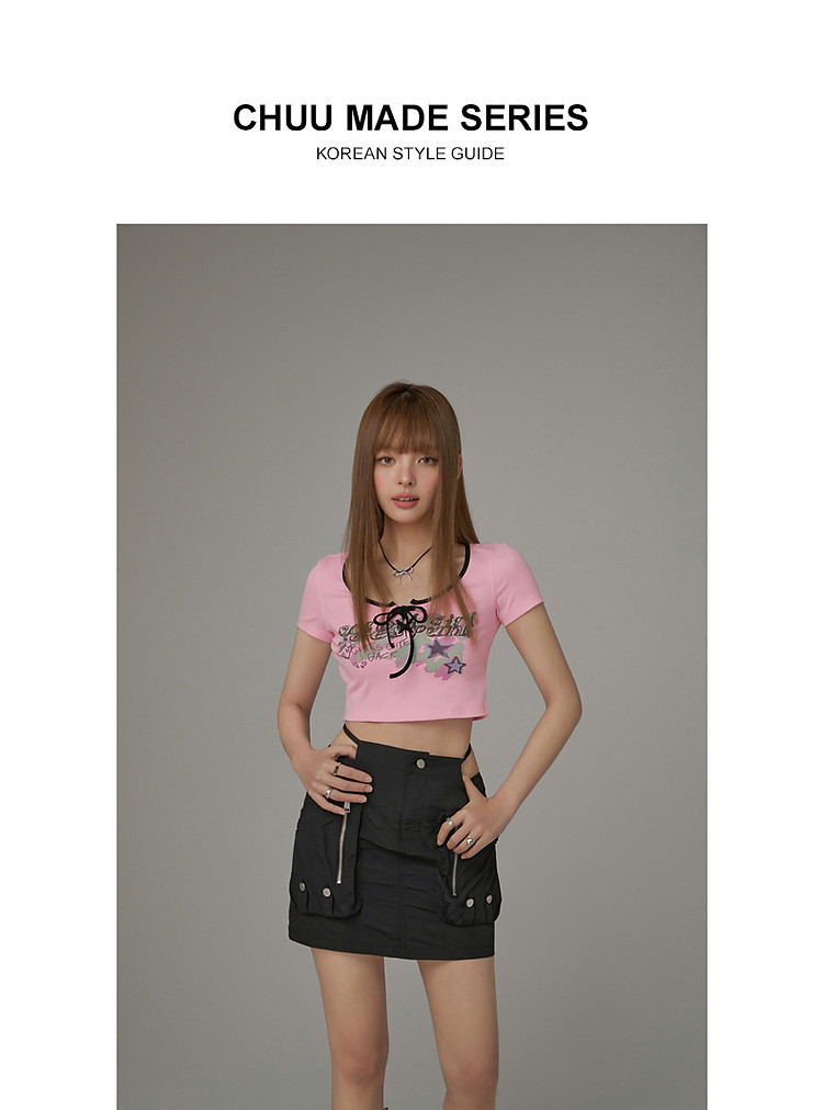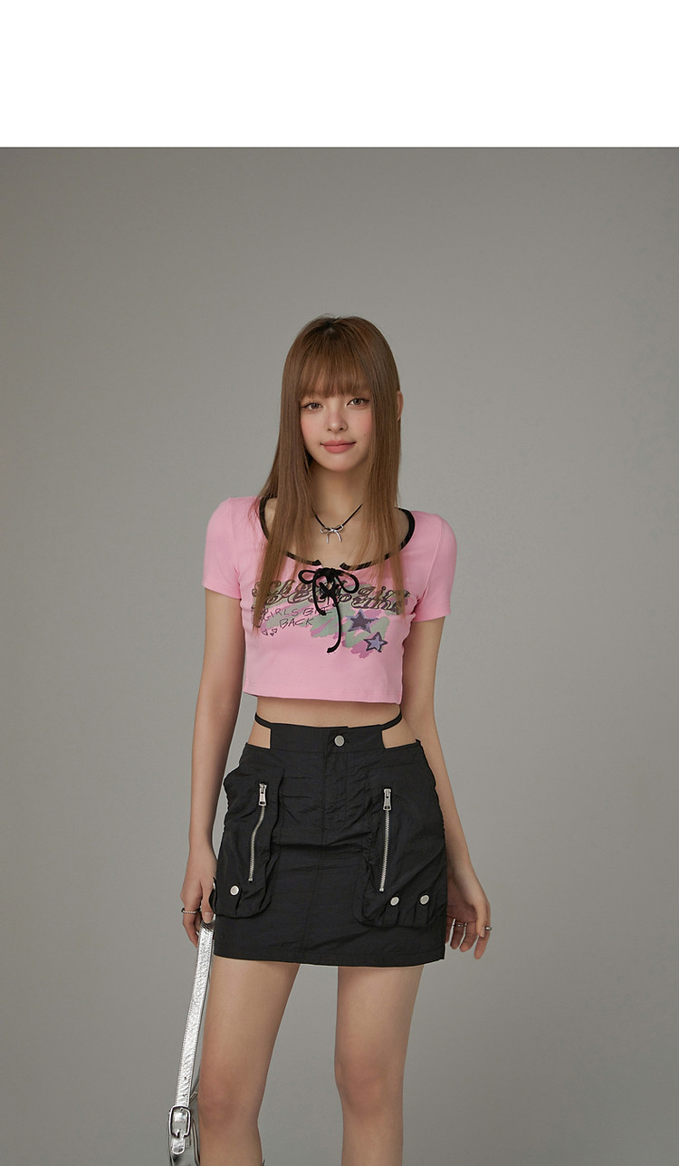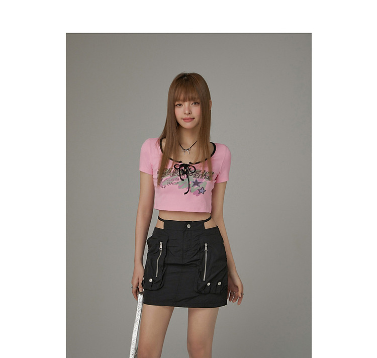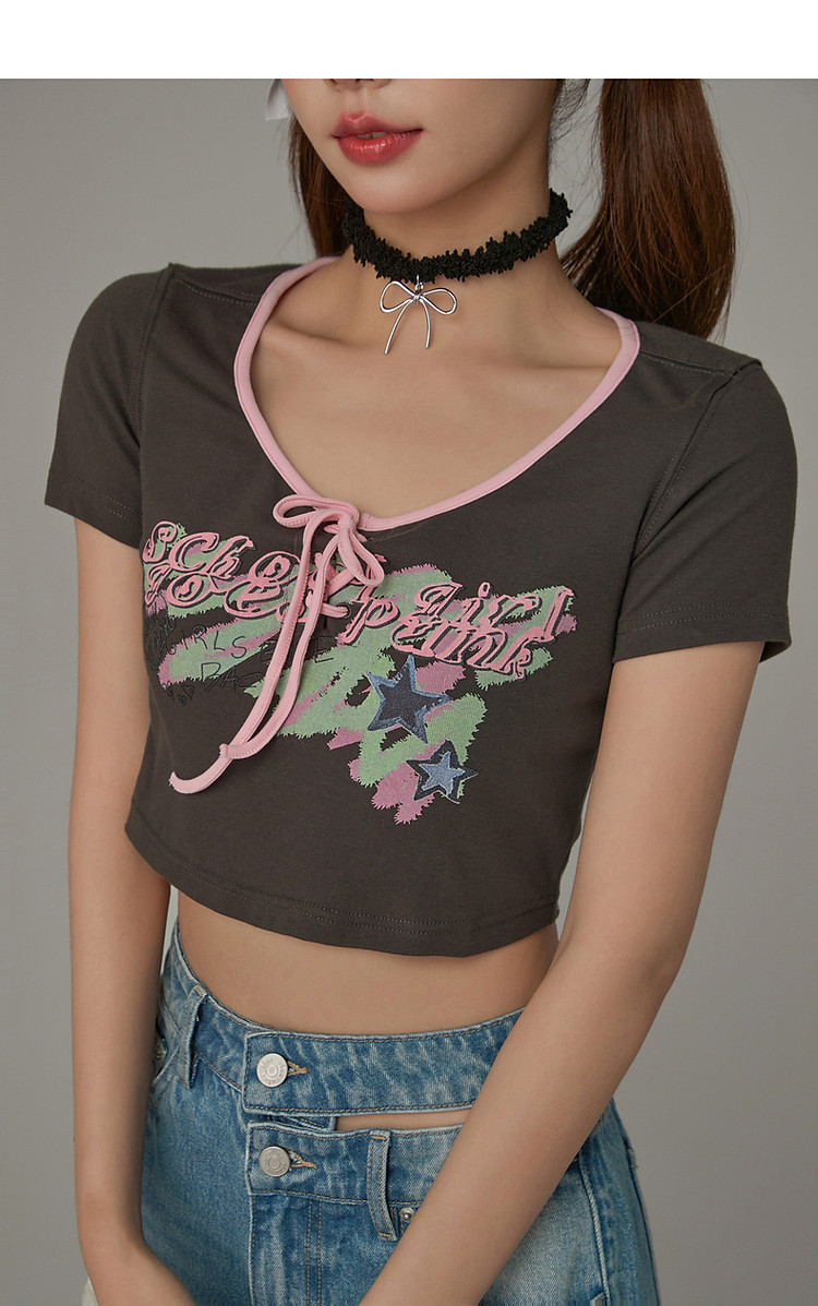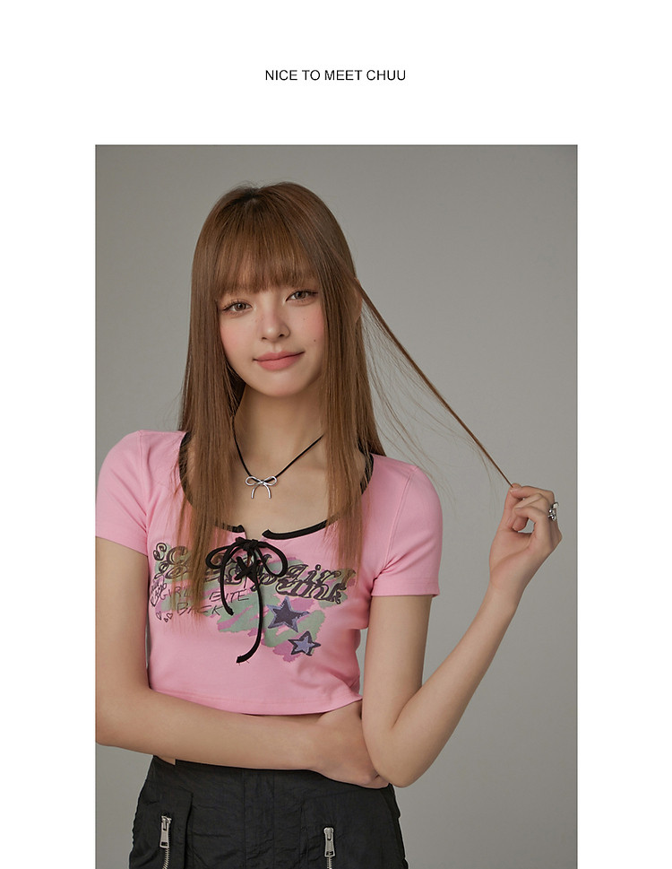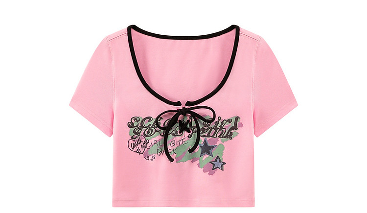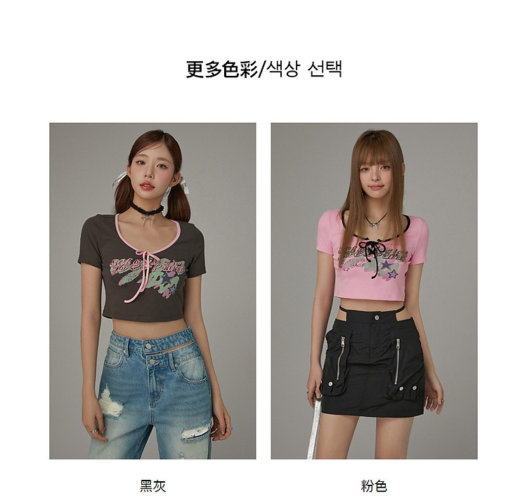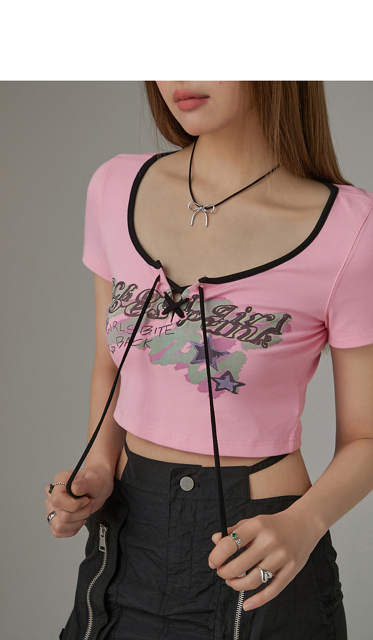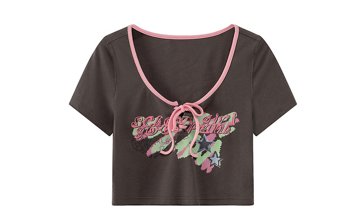 字母星星印花正肩T恤女2025夏抽绳蝴蝶结露脐短袖 336915