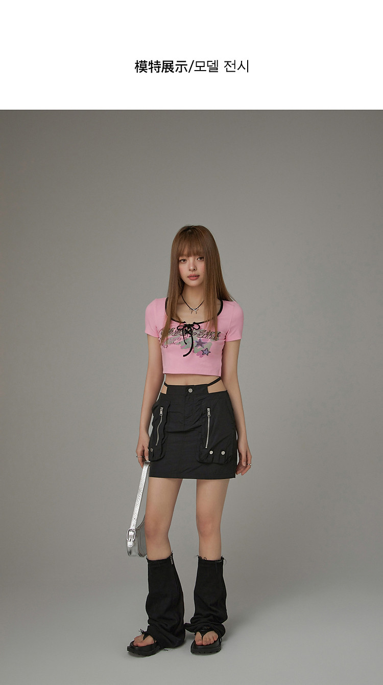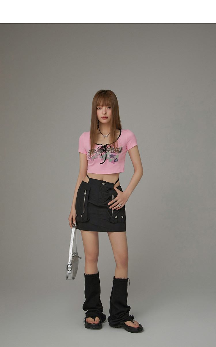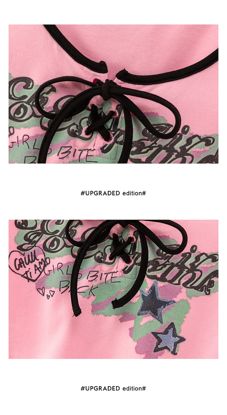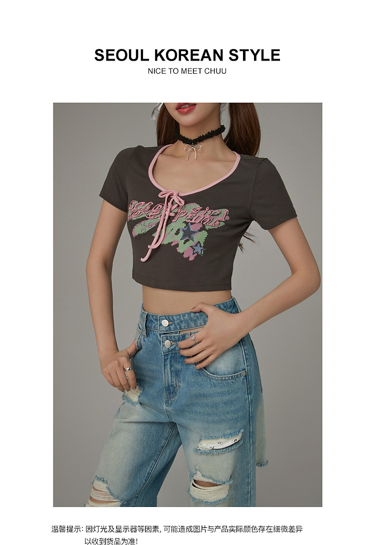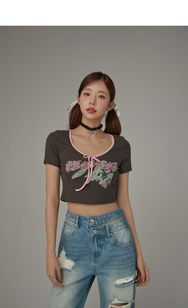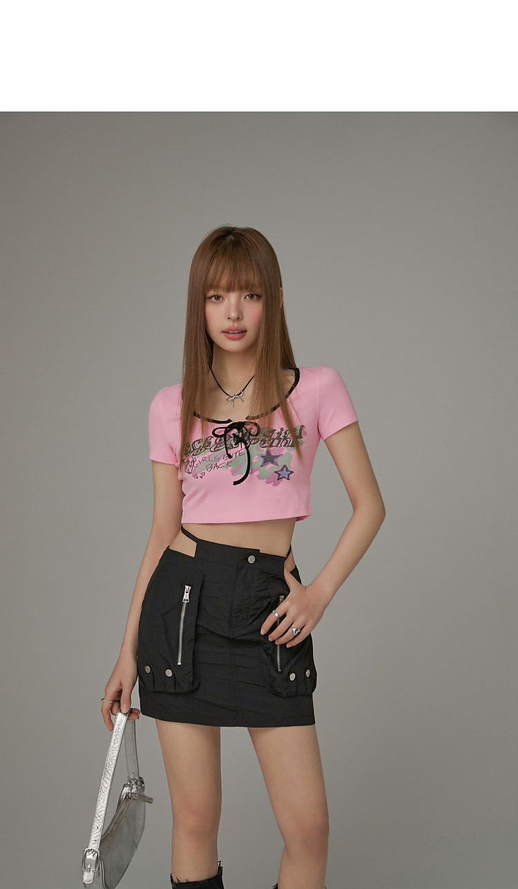 字母星星印花正肩T恤女2025夏抽绳蝴蝶结露脐短袖 336915