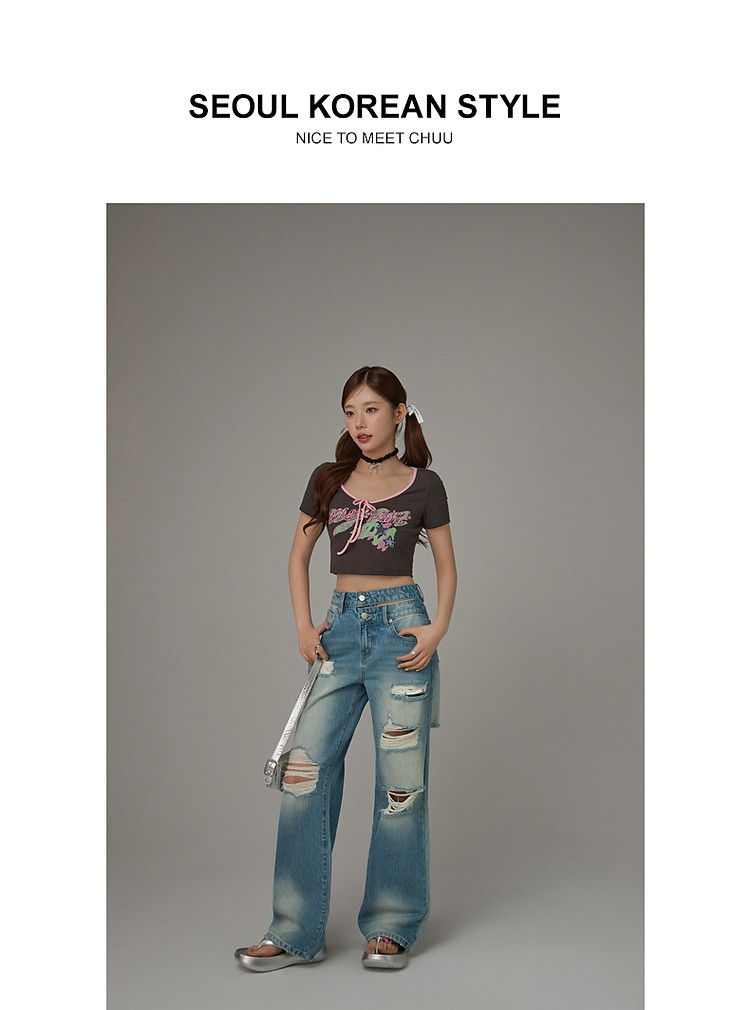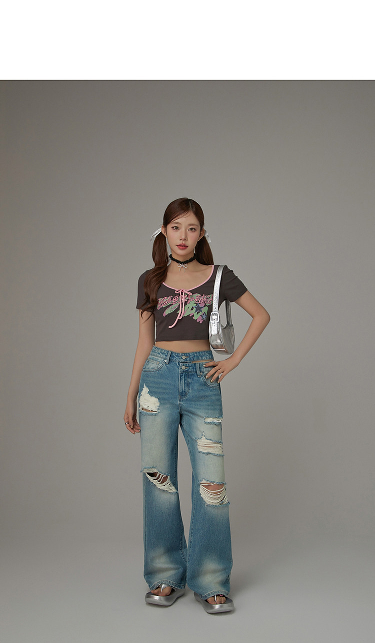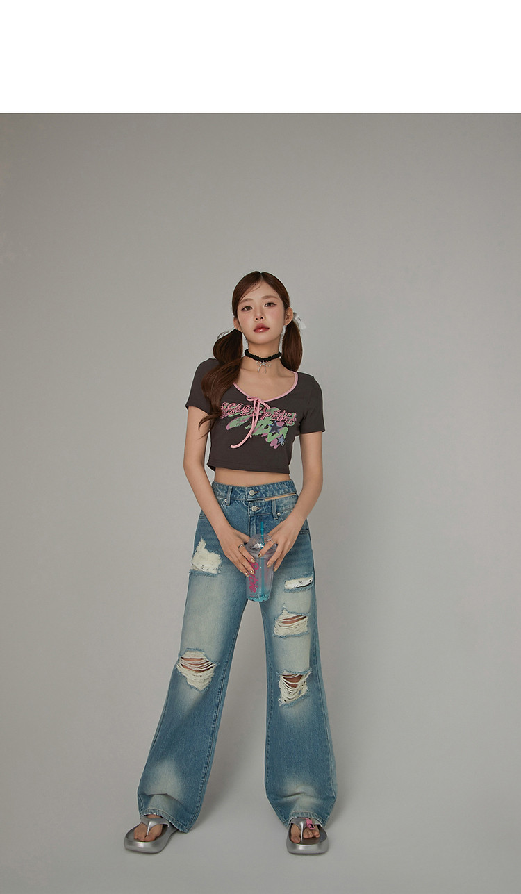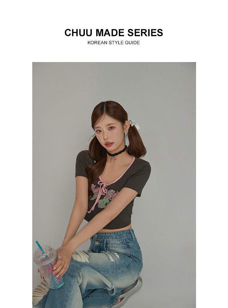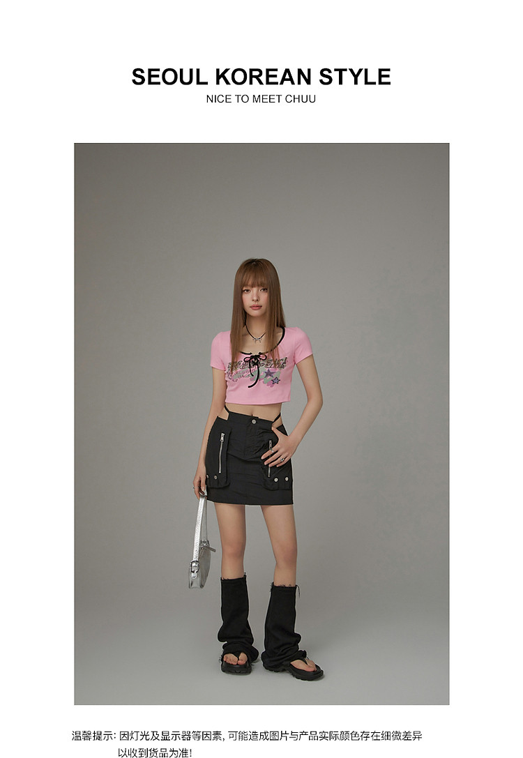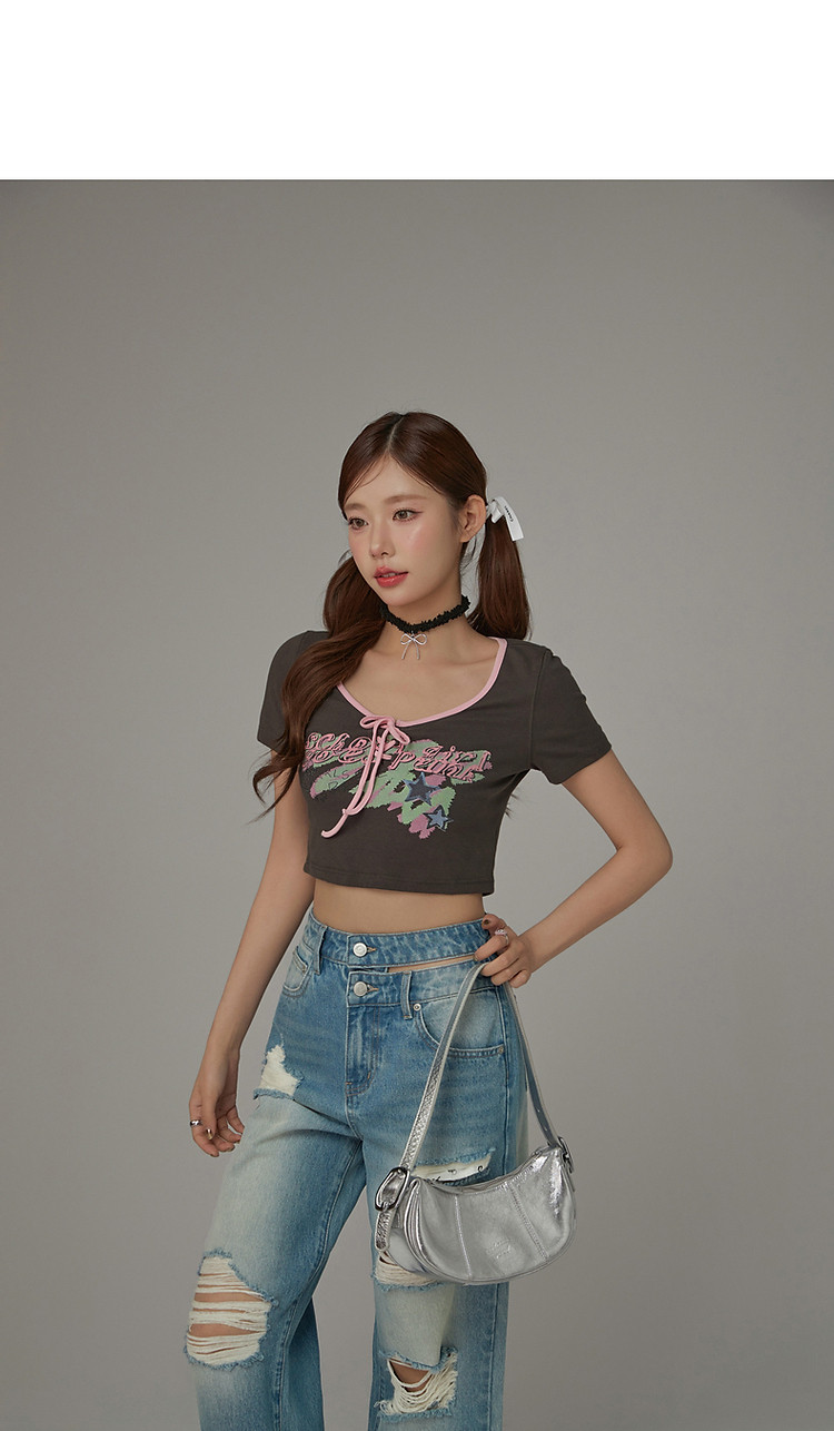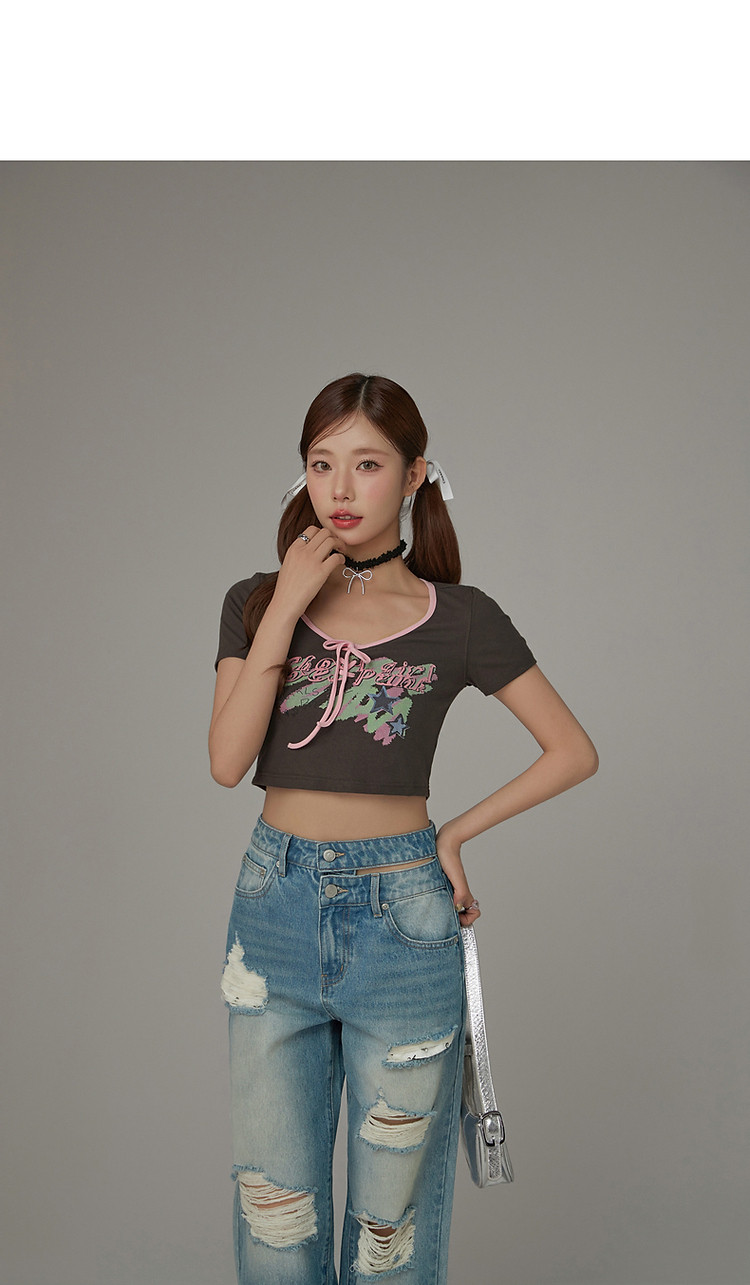 字母星星印花正肩T恤女2025夏抽绳蝴蝶结露脐短袖 336915